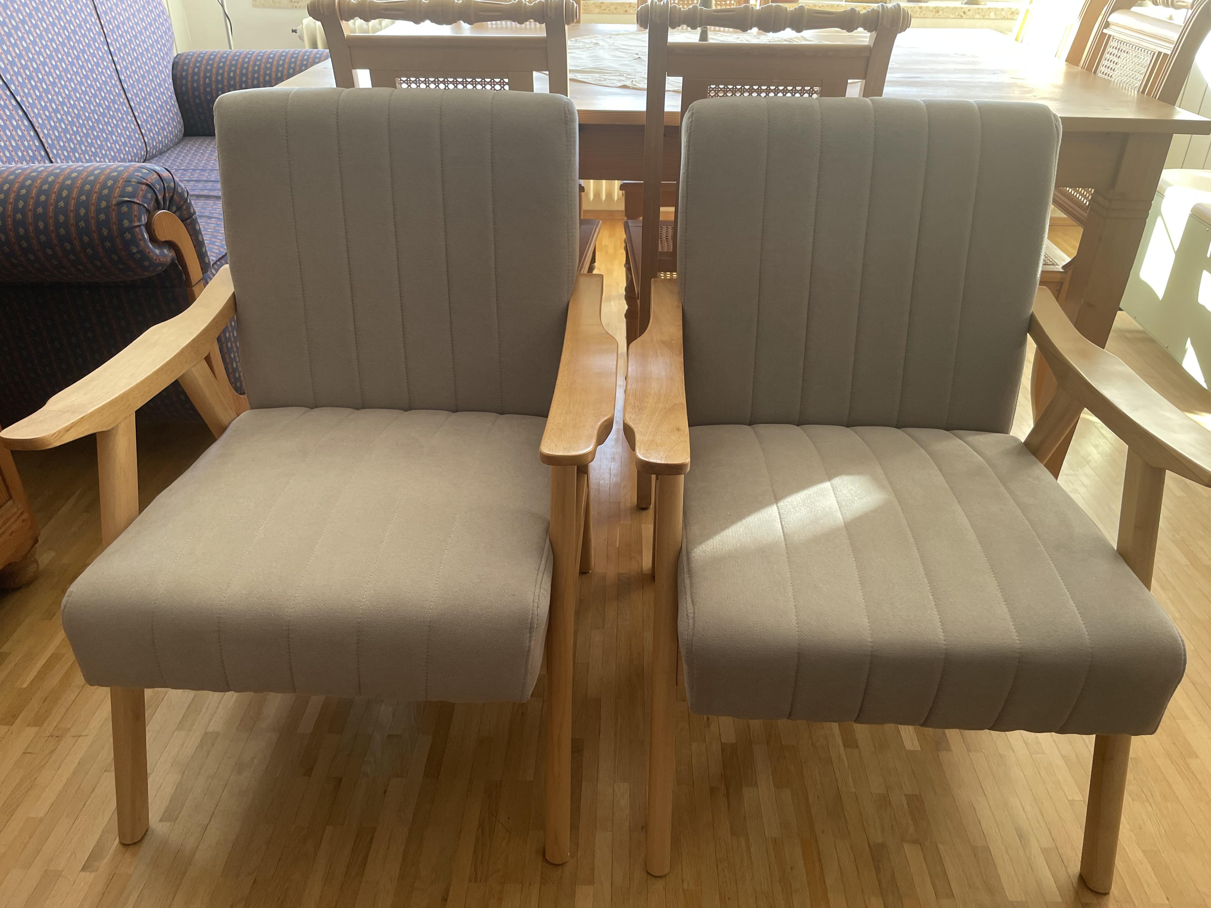 die Stühle können ab sofort abgeholt werden. PS.: Moin Herr Moschner, sollten Sie noch interessiert sein, bitte melden. Für die anderen: Die Stühle sind neuwertig. Traglast = 120 kg Handy : 015202105926. Marke = HOMCOM, Maße = 68 x 74 x 82 cm, Stoffbezug in hellgrau, bequeme Relaxsessel