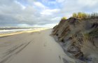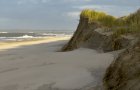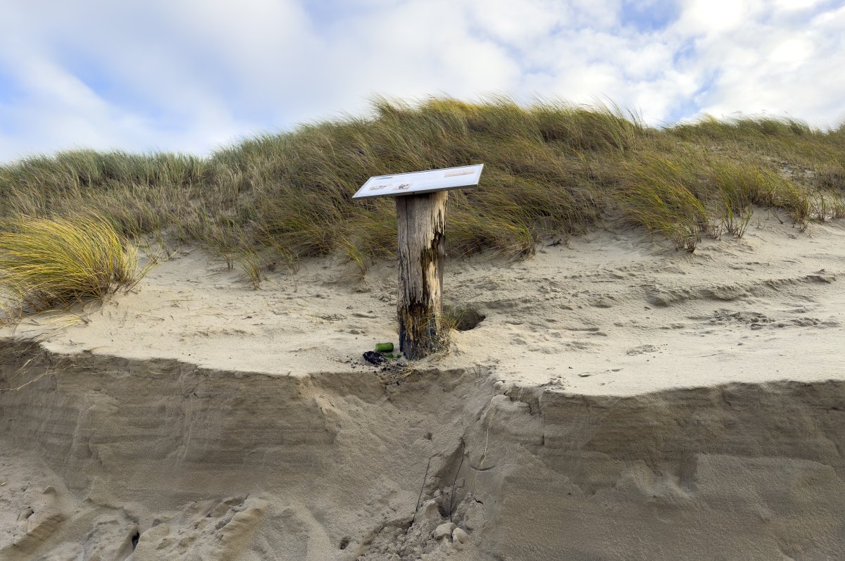 Joshua hatte es in sich... die Hochwasser des Sturmes waren zwar nicht dramatisch hoch, aber an der neuen Schwachstelle im Knick am Nordstrand haben die Wellen ordentlich Sand abgetragen, sodass jetzt das Schild hoch über der neuen Kante steht. Diese war im Sommer dort noch mindestens zwölf Meter weit weg. Und so niedrig war das Strandniveau an dieser Stelle seit ewigen Zeiten nicht. Also, nicht, dass ich wüsste.