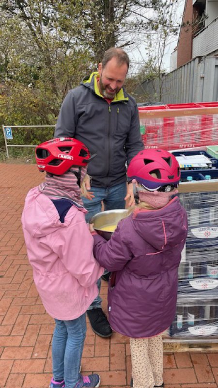 Da aber noch so viel der Suppe übrig war, verteilten die Kinder der Klasse 1/2 noch ein bisschen Suppe an unterschiedlichen Stellen auf der Insel, z.B. an das Nationalparkhaus und den Frischemarkt als großes Dankeschön für die immer großartige Zusammenarbeit. Auch der Kindergarten kam in den Genuss unseres zubereiteten Gemüses. Nach der Verteilaktion war die leckere Kürbissuppe dann auch leer.