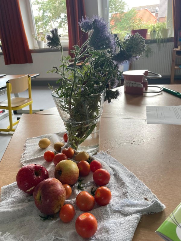 Die Kinder der Garten-AG ernteten im Laufe der Wochen viel Gemüse in ihrem eigenen Schulgarten. Sie haben eine Menge geerntet, wie z.B. Kartoffeln, Karotten, Tomaten und Zwiebeln. Sie hatten viel Freude beim Verteilen des Gemüses in der Schule und auch die Kinder sowie die Lehrkräfte freuten sich über einen leckeren Snack.