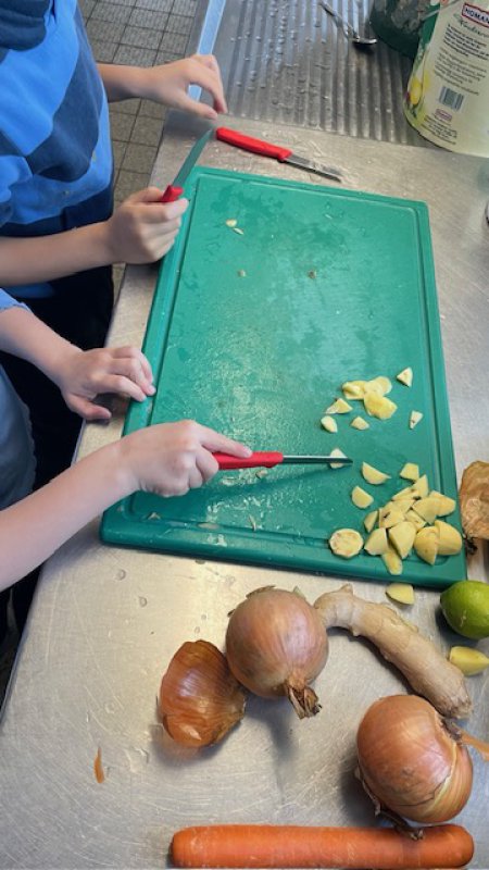 Da aber im Schulgarten auch ein großer Kürbis wuchs, hat die Sonnenhütte ihre Räume zur Verfügung gestellt, um dort eine leckere Kürbissuppe zu zaubern. Es gab viele Aufgaben, die die Kinder super übernommen haben: schälen und schneiden des Gemüses, den Tisch decken und natürlich auch ein bisschen beim Kochen zu helfen. Am Ende durften die Kinder die Kürbissuppe genießen.