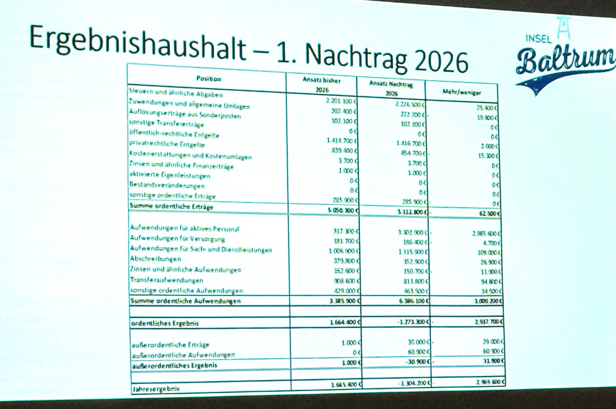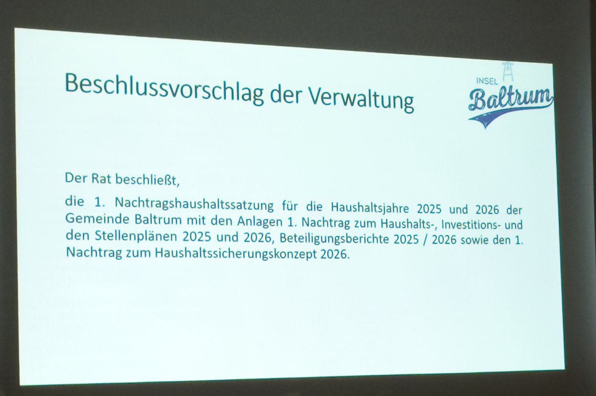 Die Messbetragssumme für die Hebesätze der Grundsteuern sei um 19.000 Euro gegenüber dem Ansatz im Doppelhaushalt 25/26 zurückgegangen, stellte Baltrums Kämmerer Dennis Pollmann bei der Ratssitzung am 14. November fest. Das bedeutet, dass der ursprüngliche aufkommensneutrale Hebesatz für Grundsteuer A und B von 574 für 2025 um 13 Prozent erhöht hätte werden müssen (auf 560) und nunmehr für 2026 auf 590 von Hundert steigt. Die Gewerbesteuer bleibt auf 400 v. H..