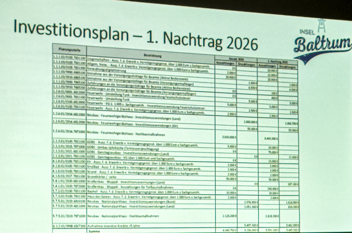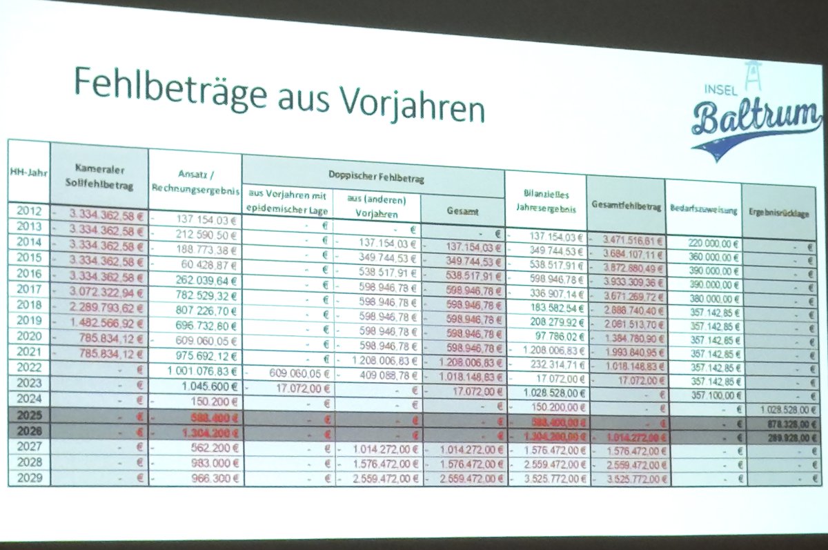 Bis 2029 wird die Gemeinde Baltrum ein Fehl von 3,50 Mio Euro angehäuft haben, das fortan, schon ab 2026, mit einem Haushaltssicherungskonzept zu verwalten ist, stellte Pollmann in Aussicht. Dies sind Maßnahmen wie Erhöhung der Mieten und Pachten, Entgelterhöhungen SindBad, Strandkorbvermietung, ab 2027 nochmal Grundsteuern A und B und die Hundesteuer, ab 2030 Zweitwohnungssteuern und Einführung einer Betten- und Übernachtungssteuer. Einsparungspotenzial und Mehreinnahmemöglichkeiten seitens der Gemeinde tauchen im Haushaltsplan zwar „ansatzweise“ auf, allerdings ohne konkretes Konzept.