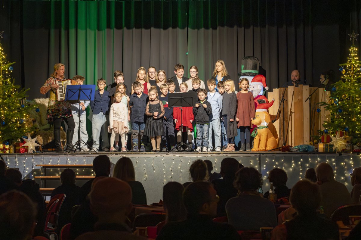 23 Kinder sangen beim Kindernikolausball am Donnerstag, dem 4. Dezember 2025, als „Kindershantychor Baltrum“ auf der großen Bühne im geschmückten und gefüllten Saal der Turnhalle auf Baltrum. Das ist Rekord.