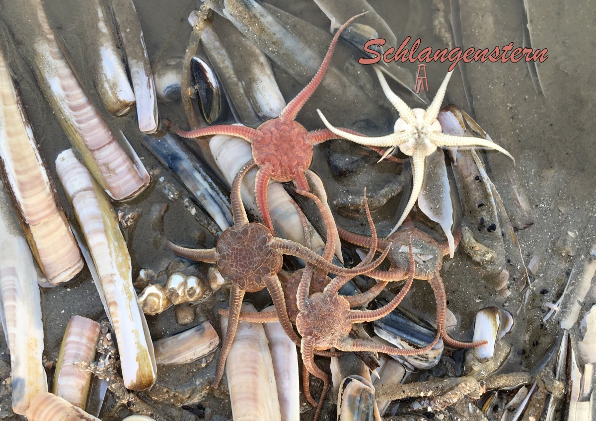 Ähnlich in der Form ist auch der Kammstern (Astropecten irregularis), welcher nicht so oft entdeckt wird. Vielleicht kommt es daher, dass seine Füßchen keine Saugscheiben haben, deshalb lebt er meist eingegraben im Sand. Interessant wird es, wenn eine größere Menge an Schlangensternen (Ophiura ophiura) anlandet. Bei näherer Betrachtung am Strand sind sie sehr beweglich und recht schnell in der Fortbewegung. Zu beobachten sind sie alle nicht sehr lange, denn hungrige Möwen und kleine Seevögel freuen sich über den reich gedeckten Tisch.