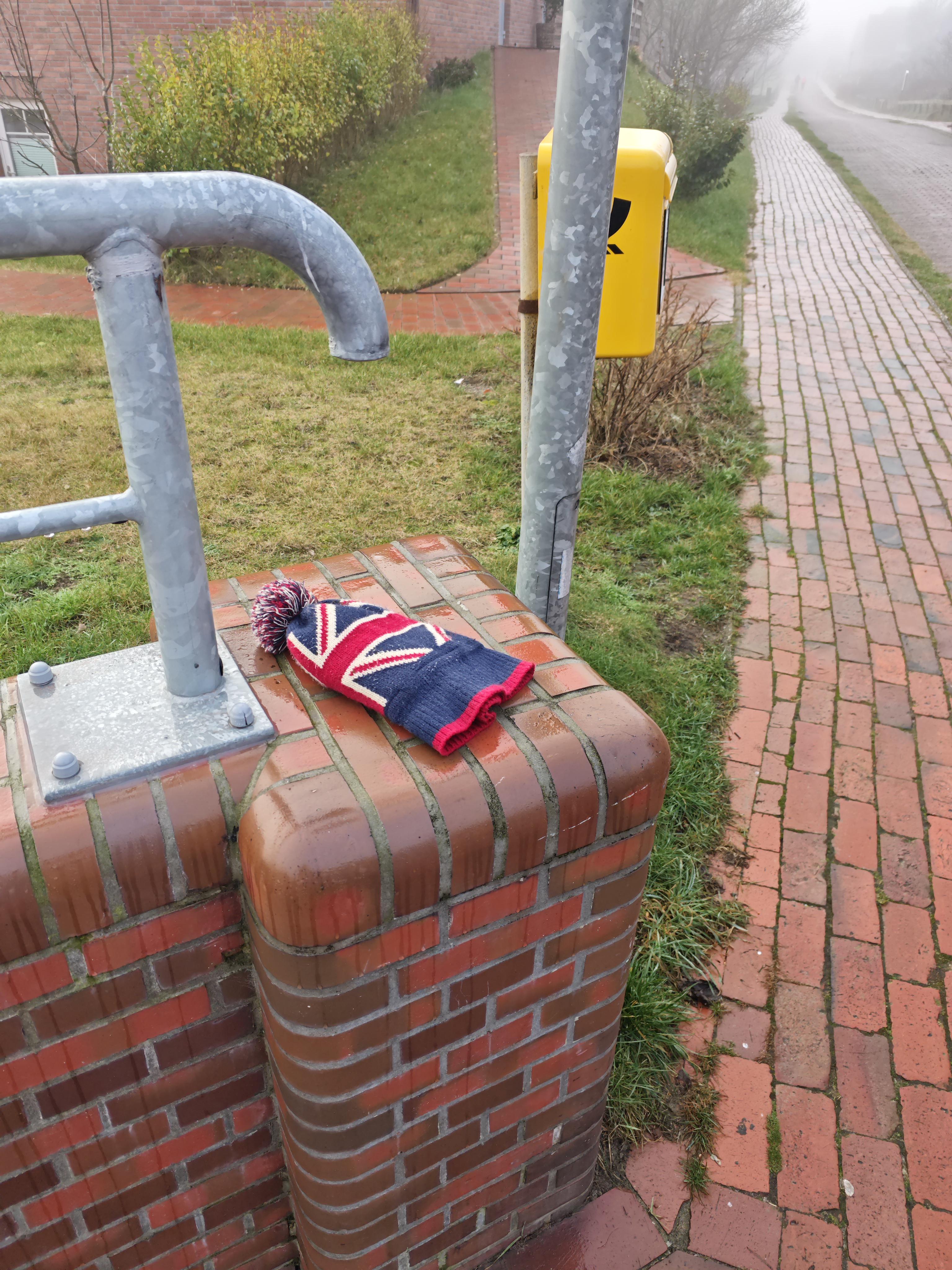 Mütze mit Bommel in blau, rot, weiß. Liegt weiterhin auf der Mauer am Briefkasten.