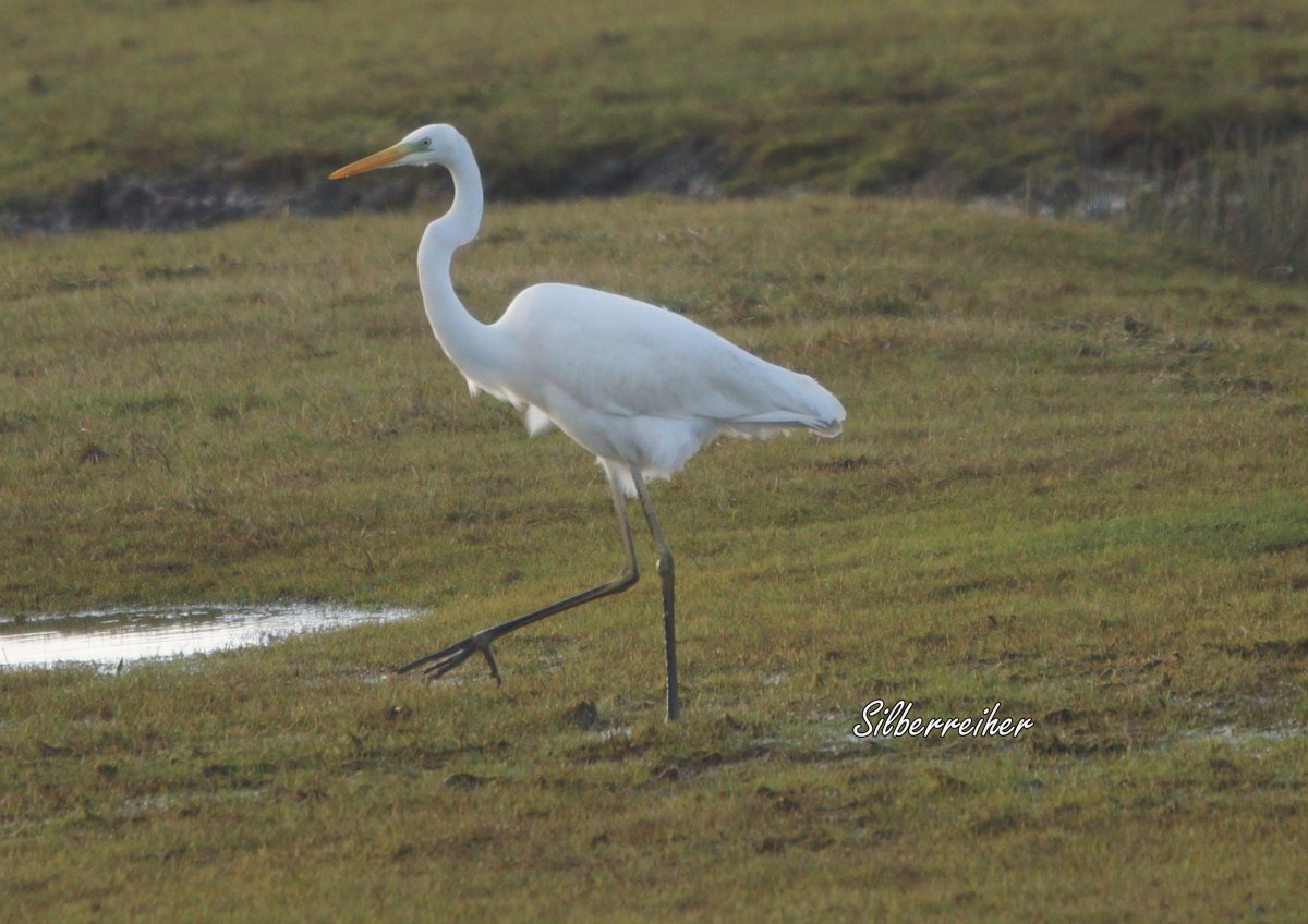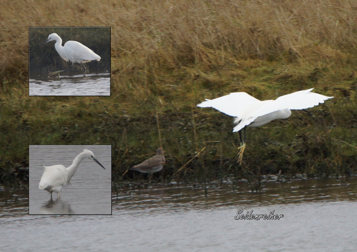 Wie auf den Fotos leicht erkennbar: Reiher ist nicht eben Reiher. Gefieder, Schnäbel, Beine, Größe, und vor allem beim Seidenreiher muss die Zehenfarbe beachtet werden. Der Baltrumer Spielteich, Heller und Umgebung bieten sich zur Nahrungsaufnahme der langschnäbeligen und -beinigen Vögel jetzt im November bestens an. Ebenso ringsum die Gräben mit gutem Schilfbewuchs und guter Deckung bei vermeintlicher Gefahr. Silberreiher und Graureiher kommen in unseren Breiten schon etwas häufiger vor, wogegen Seidenreiher bei uns zu einer etwas seltener auftretenden Spezies gehören. Dieser Wintergast hier fliegt nach einiger Zeit höchstwahrscheinlich weiter, denn so warm wie in Afrika, seinem Überwinterungsgebiet, wird es auf Baltrum sicher nicht. Jetzt zum zweiten Lockdown ein willkommener Anlass zum Beobachten!
