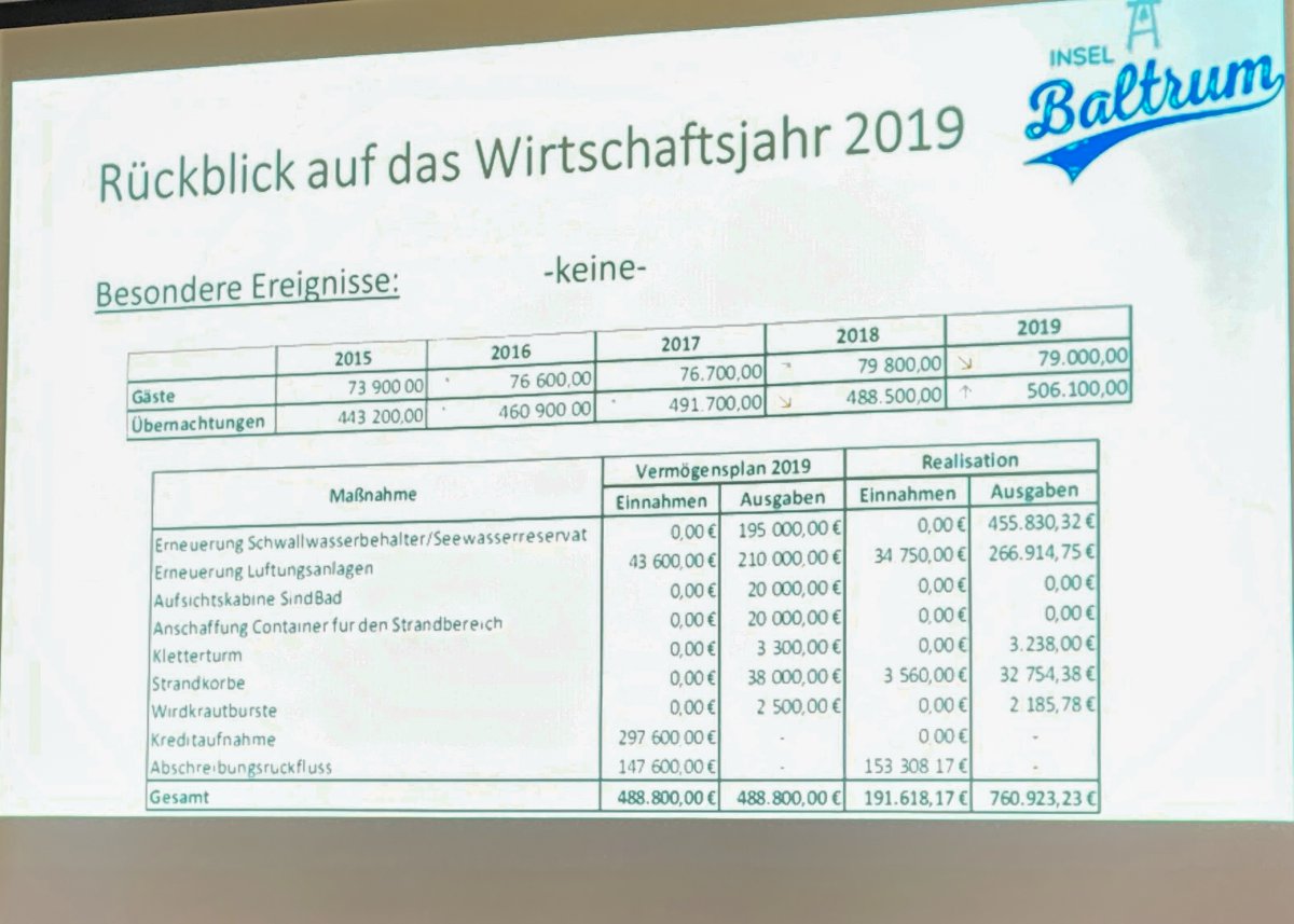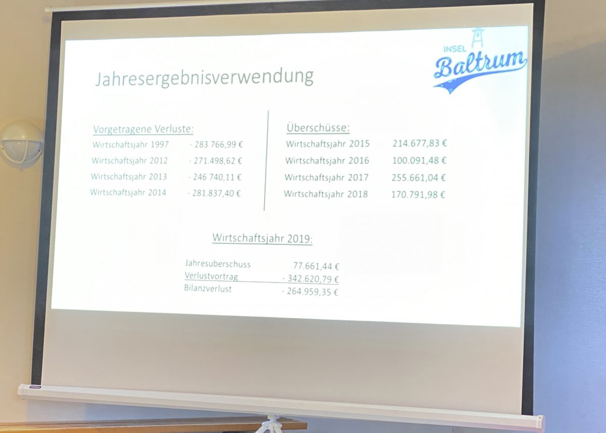 Kämmerer Harm Ubben, der schon öfters für Baltrum tätig war, hatte Verstärkung vom Landkreis Aurich mitgebracht: Dennis Pollmann stellte zunächst das Zahlenwerk zum Jahresabschluss 2019 des Eigenbetriebes Kurverwaltung vor. Im Wirtschaftsjahr 2019 gab es (noch) keine "außergewöhnlichen Ereignisse", der kalkulierte Bilanzverlust beträgt 265.000 Euro. Die Personalkosten würden steigen, die Umsatzerlöse stagnieren, fasste er zusammen. Vor allem im Bad ergebe sich ein erhebliches Defizit. Dem Konsolidierungsauftrag inklusive Verlustabbau stünden Investionen und der Instandhaltungsstau gegenüber, bilanzierte Pollmann. Wie zuvor der Verwaltungsrat beschloss der Betriebsausschuss zur Empfehlung für den Gemeinderat einstimmig den Jahresabschluss 2019 des Eigenbetriebes Kurverwaltung wie auch den Lagebericht. Der Jahresüberschuss von 77.661,44 Euro wurde zur Deckung der Jahresfehlbeträge aus den Vorjahren bestimmt, dem Kurdirektor und Betriebsleiter wurde Entlastung erteilt.