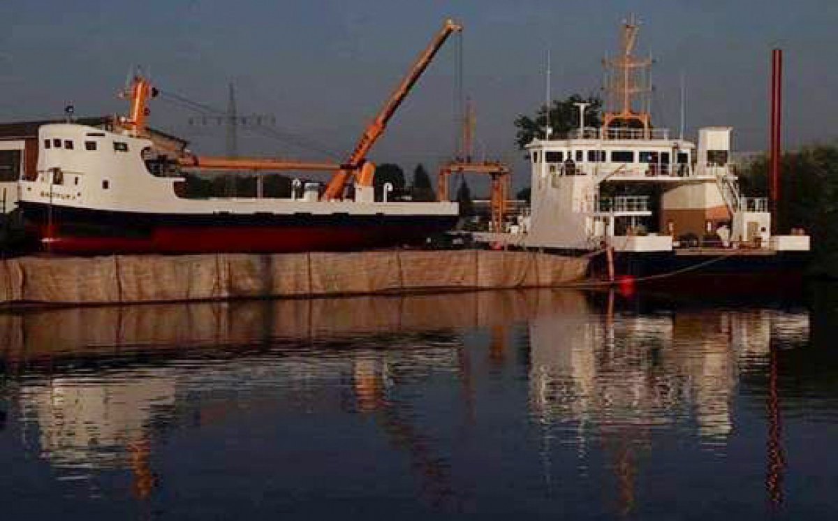 Die MS Baltrum II und der Schiffsneubau NB 1002 treffen auf der Werft in Oldersum aufeinander, die MS Baltrum II auf der Helling-Anlage, und der Schiffsneubau liegt längsseits zur Pier.