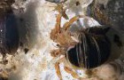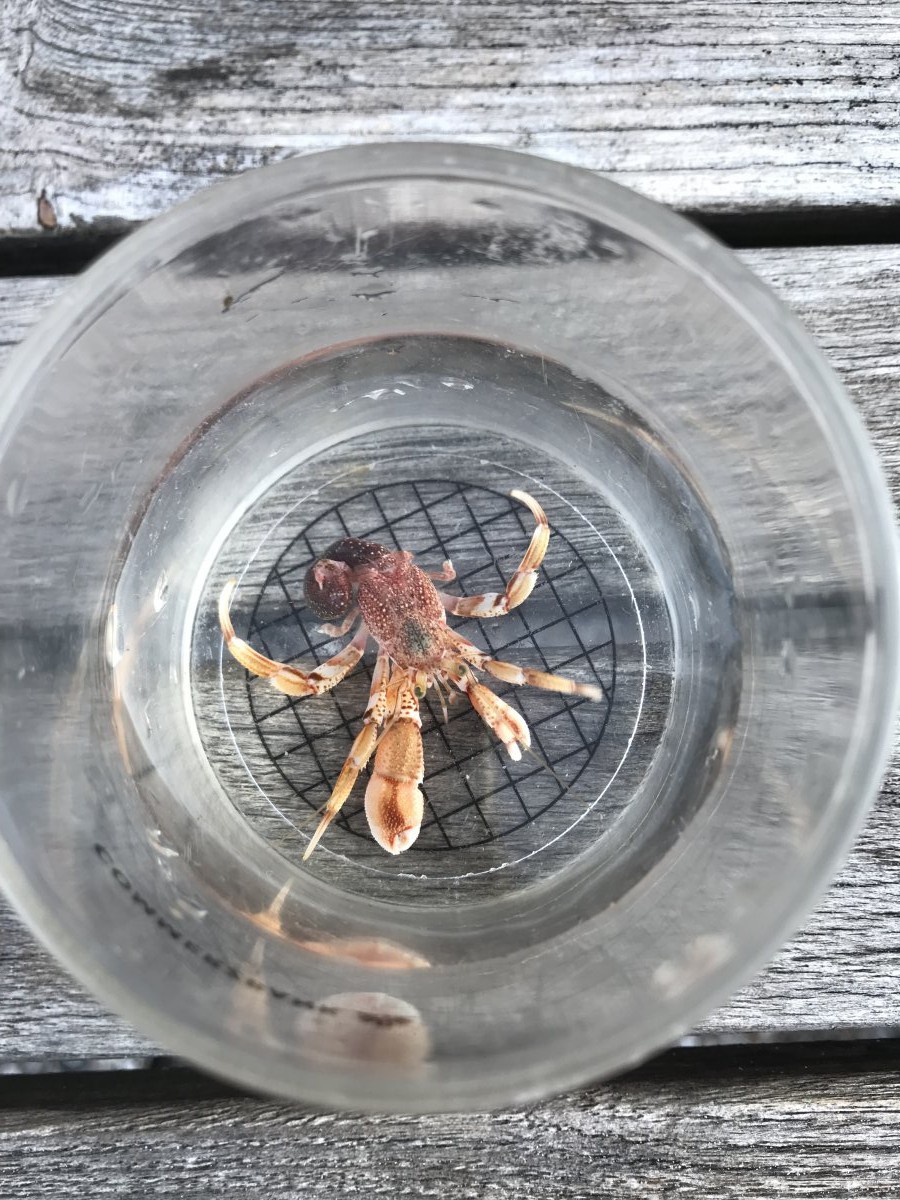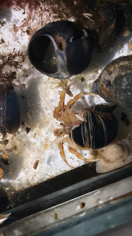 Dieser Einsiedlerkrebs lebt im Aquarium des Nationalpakr-hauses auf Baltrum und war wohl auf der Suche nach einem neuen Haus. Da es keine passenden neuen Häuser im Aquarium für ihn gab, haben die Mitarbeiterinnen und Mitarbeiter in ihren privaten Schneckenhaussammlungen nach einem passenden Häuschen gesucht und ihm mehrere zur Auswahl angeboten. Sofort ist er in eines eingezogen. Doch so ganz zufrieden war er nicht: er ist noch zwei weitere Male umgezogen…