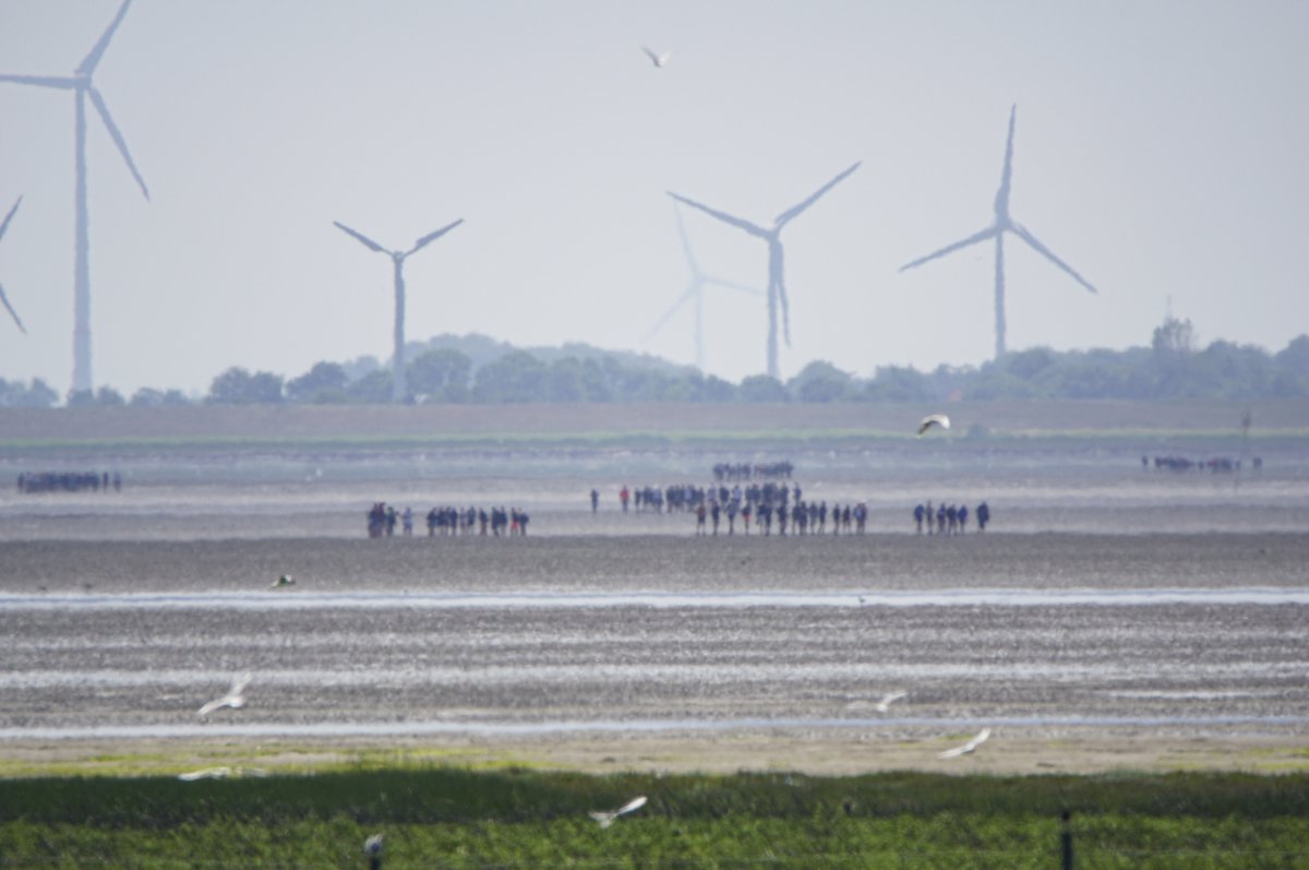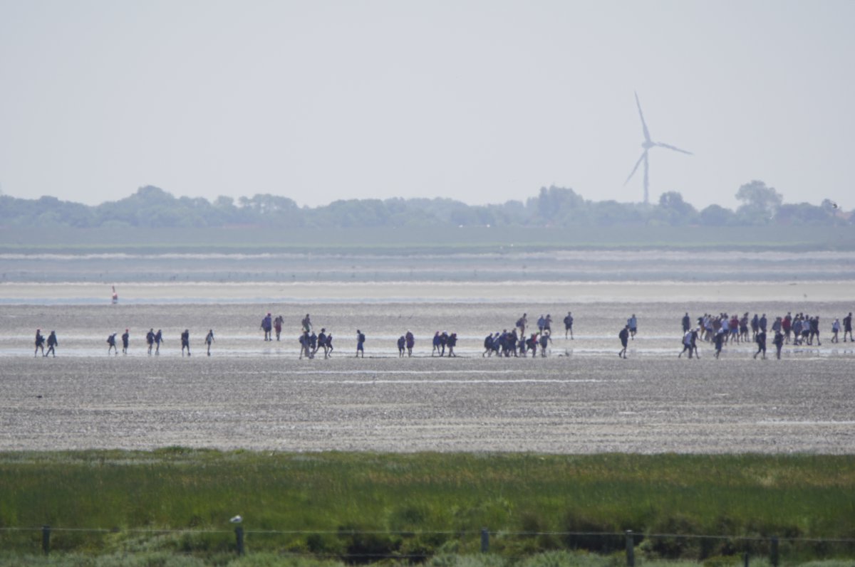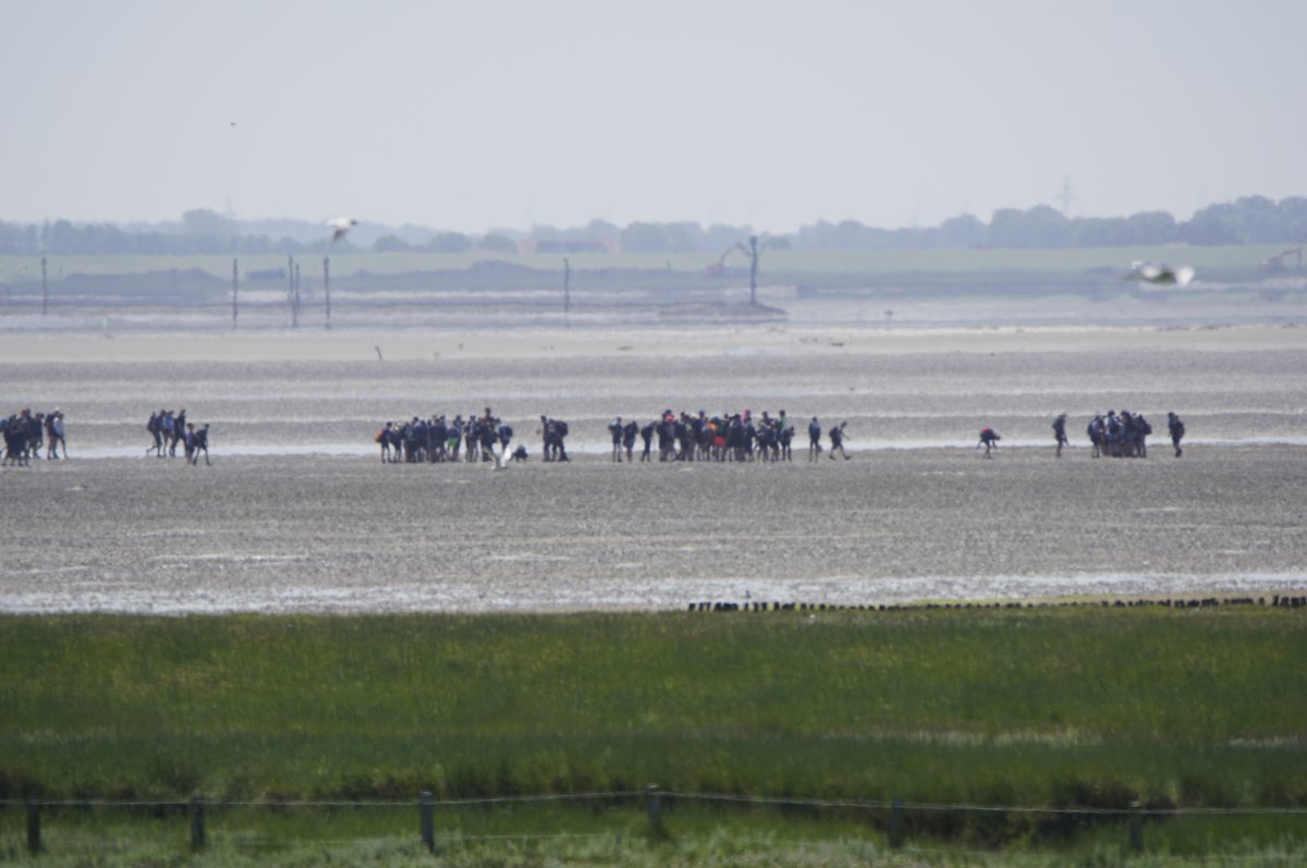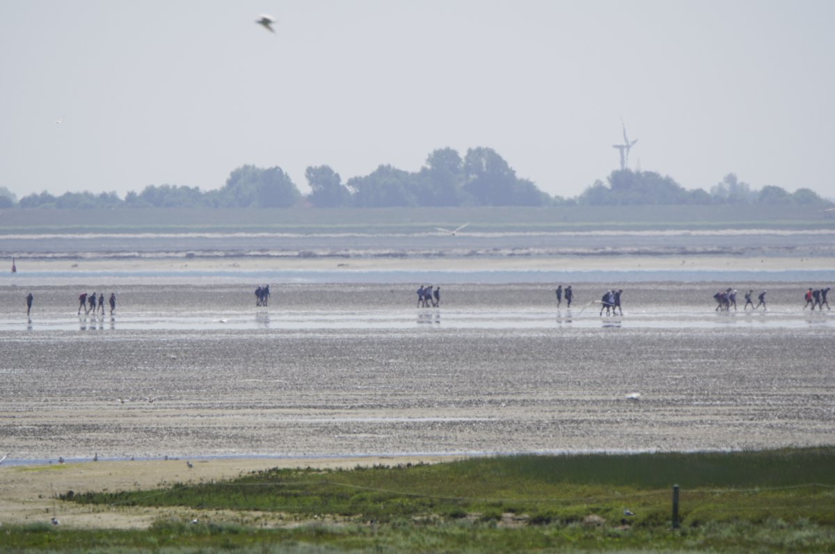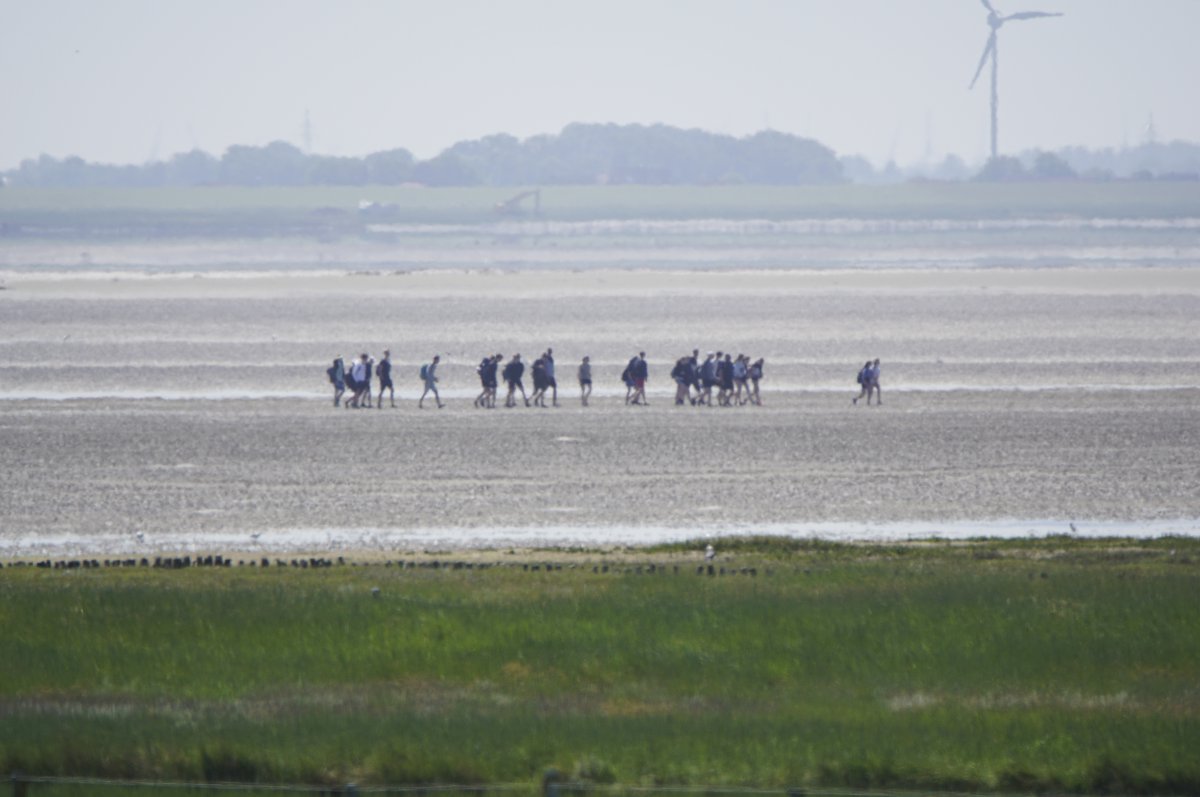 Im Sommer, wenn die Tide es zuließ, war es gefühlt jeden Tag so, in den Siebziger- und Achtzigerjahren. Damals durften die geführten Gruppen noch größer sein. Der Wattausstieg führte an der Alten Schleuse entlang Richtung Ententeich (wo mitunter Kurbeitragskontrolle oder zumindest Empfang war) – der Deich war noch nicht erhöht, die Straße lag noch südlich des Ententeichs. Das Watt war mitunter "schwarz von Watties", hieß es dazumal. Und die Sicht hinter von hier aus den Deich war nicht von Windrädern vertikalisiert... (und der Deich drüben auch noch nicht so hoch).