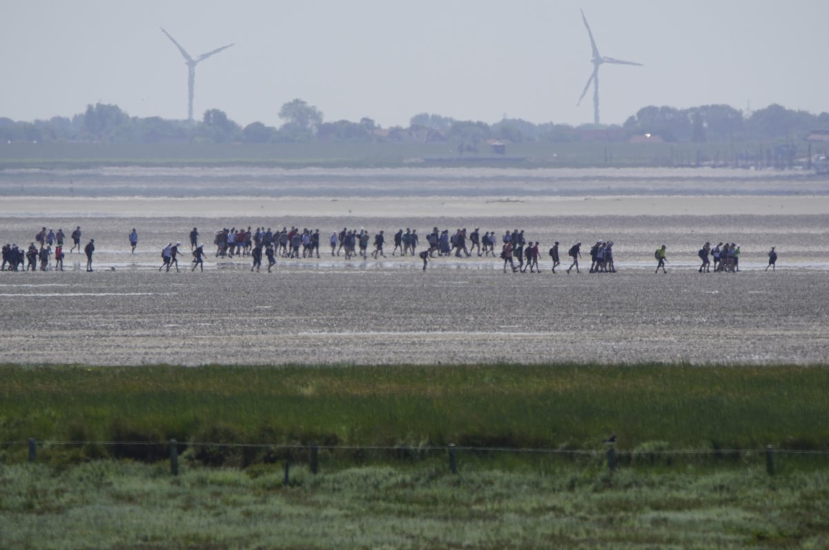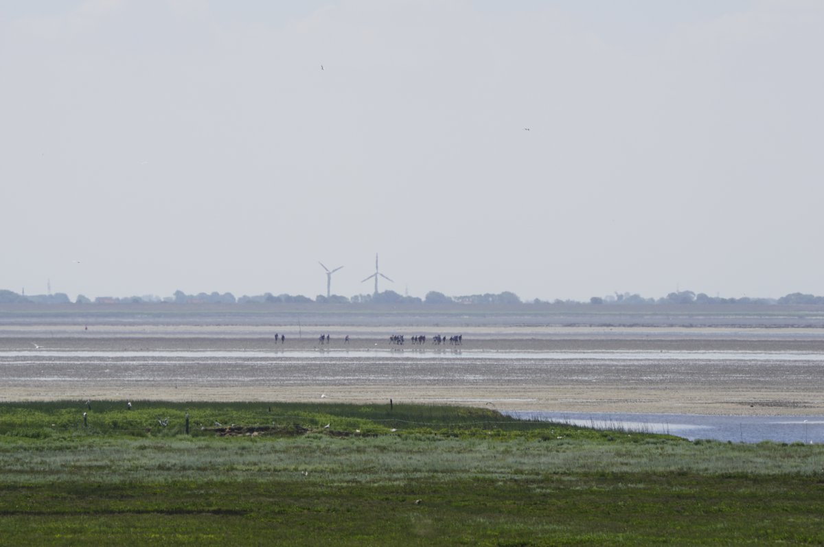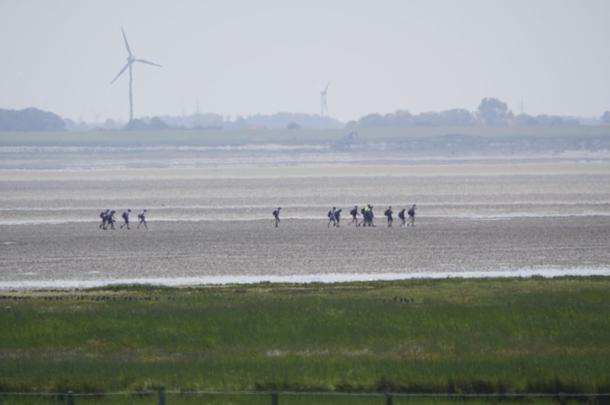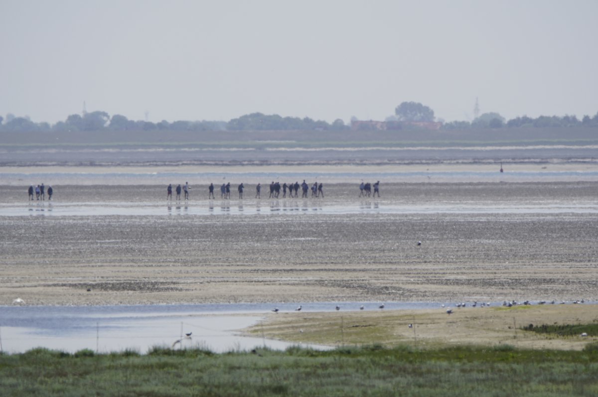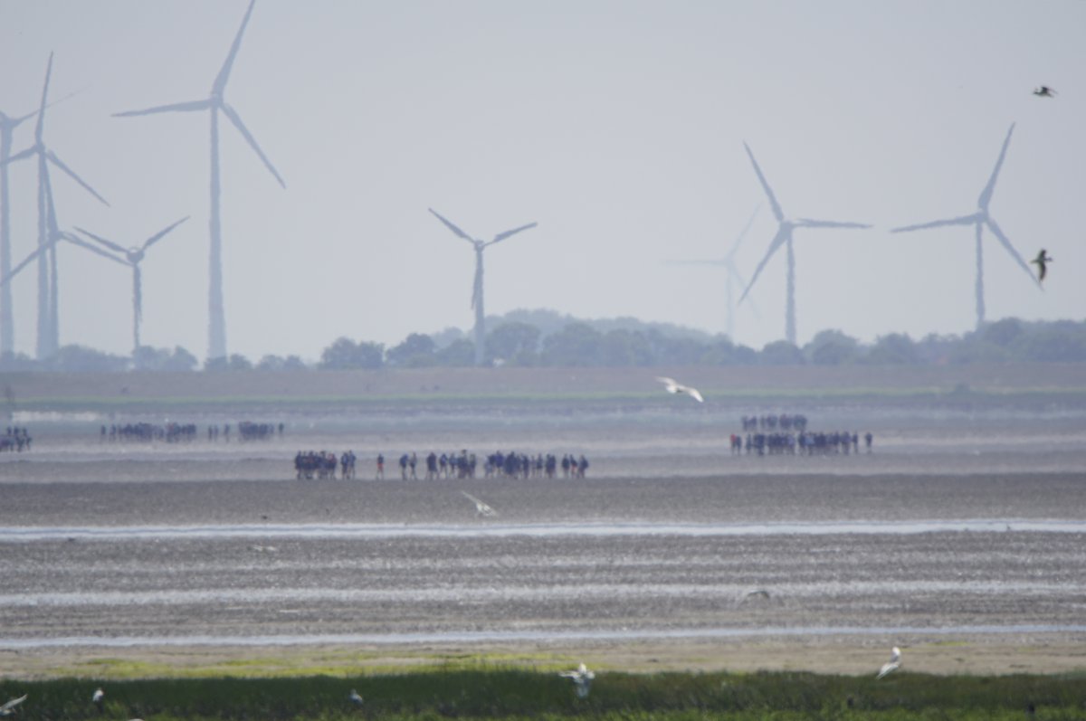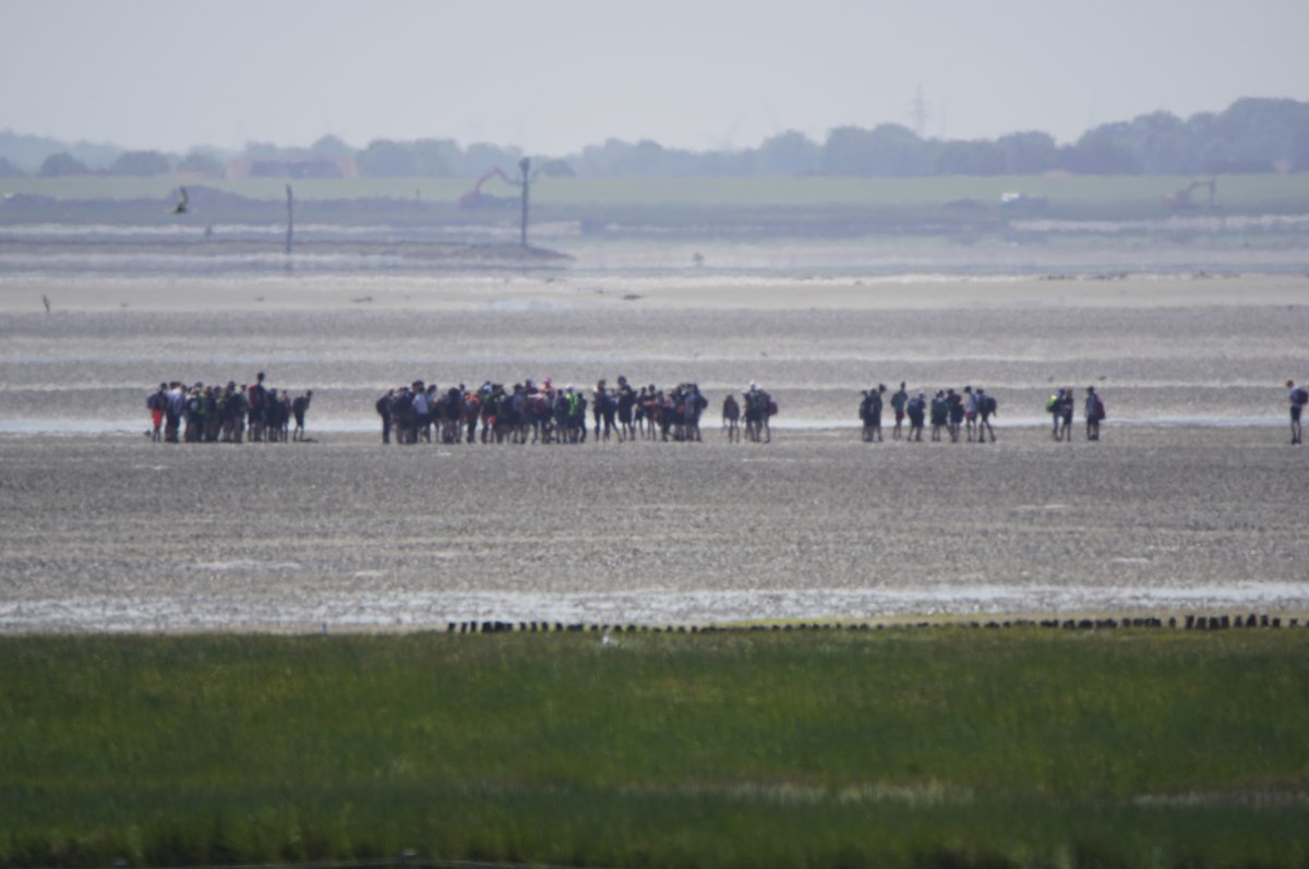 Im Sommer, wenn die Tide es zuließ, war es gefühlt jeden Tag so, in den Siebziger- und Achtzigerjahren. Damals durften die geführten Gruppen noch größer sein. Der Wattausstieg führte an der Alten Schleuse entlang Richtung Ententeich (wo mitunter Kurbeitragskontrolle oder zumindest Empfang war) – der Deich war noch nicht erhöht, die Straße lag noch südlich des Ententeichs. Das Watt war mitunter "schwarz von Watties", hieß es dazumal. Und die Sicht hinter von hier aus den Deich war nicht von Windrädern vertikalisiert... (und der Deich drüben auch noch nicht so hoch).