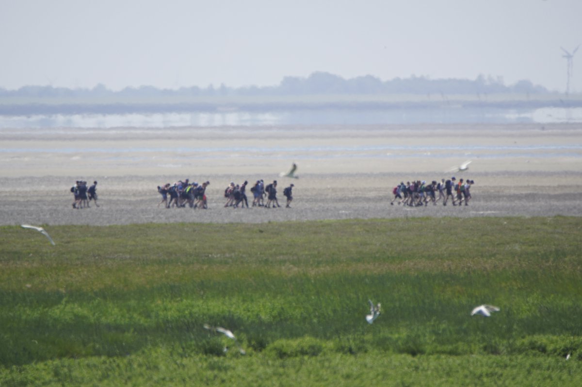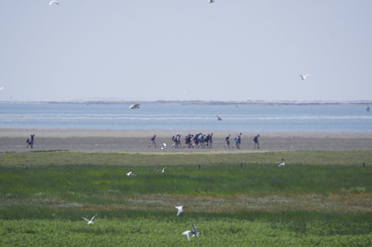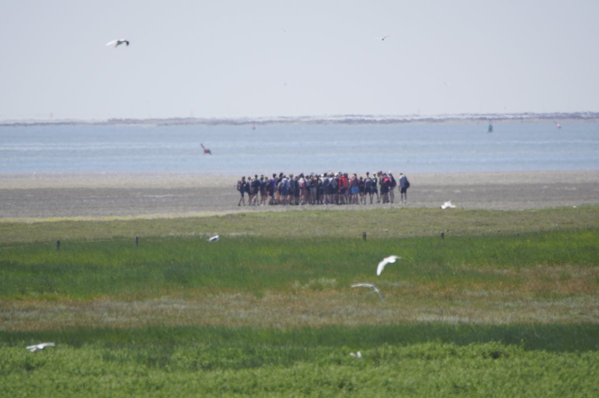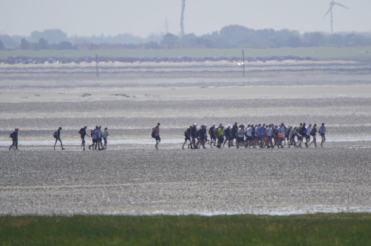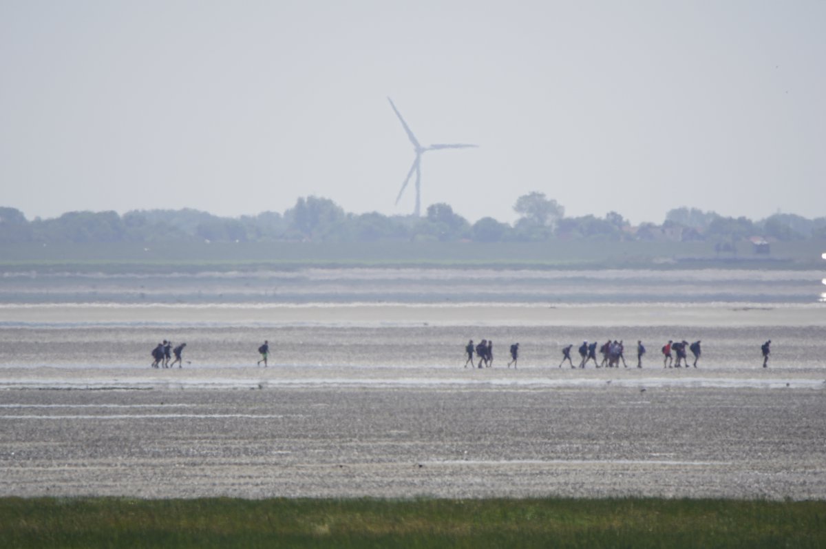 Im Sommer, wenn die Tide es zuließ, war es gefühlt jeden Tag so, in den Siebziger- und Achtzigerjahren. Damals durften die geführten Gruppen noch größer sein. Der Wattausstieg führte an der Alten Schleuse entlang Richtung Ententeich (wo mitunter Kurbeitragskontrolle oder zumindest Empfang war) – der Deich war noch nicht erhöht, die Straße lag noch südlich des Ententeichs. Das Watt war mitunter "schwarz von Watties", hieß es dazumal. Und die Sicht hinter von hier aus den Deich war nicht von Windrädern vertikalisiert... (und der Deich drüben auch noch nicht so hoch).
