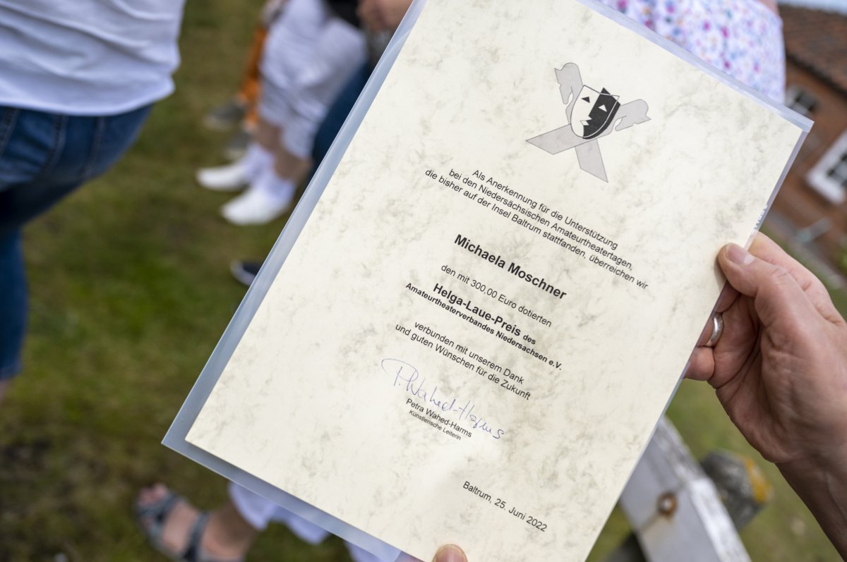 Als Stellvertreterin für die eingeschworene und eingespielte Truppe der Sektdamen der Inselbühne Baltrum erhielt Michaela Moschner (rechts) am Sonnabend, dem 25. Juni 2022, den mit 300 Euro dotierten "Helga-Laue-Preis" des Amateurtheaterverbandes Niedersachsen. Petra Wahed-Harms und Brigitte Sante vom Verbandsvorstand (links) ließen es sich nicht nehmen, den Preis persönlich auf der Insel zu überreichen, verbunden mit einer Einladung zu Kaffee und Kuchen im Garten des Cafés Tant Dora, wo die Damen überrascht wurden. Sie wussten nämlich von nichts und freuten sich umso mehr, dass ihr fröhliches Tun über die Inselgrenzen hinaus so großen Anklang findet.
