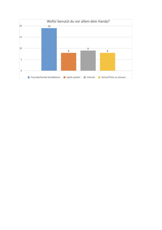 Die Ergebnisse zeigen, dass 17 unserer Schülerinnen und Schüler überwiegend ein bis zwei oder sogar mehr als drei Stunden am Tag mit dem Handy beschäftigt sind. Bei einer repräsentativen Umfrage aus dem Jahr 2024 verbringen 34 Prozent der Kinder im Alter zwischen 10 bis 12 Jahren mehr als zwei Stunden täglich am Handy, in der Altersgruppe bis 15 Jahre sind es sogar 59 Prozent. Am beliebtesten ist dabei an unserer Schule auf Baltrum die Kommunikationsapp WhatsApp, gefolgt von Snapchat, vor allem, um Freunde und Familie zu kontaktieren. Auch bei einer offiziellen Umfrage von 2022 wurde festgestellt, dass WhatsApp am beliebtesten ist. Dabei besitzen 16 unserer Schülerinnen und Schüler ein eigenes Handy und einen Fernseher, knapp die Hälfte auch ein iPad. Beruhigend für die Lehrkräfte ist, dass tatsächlich zehn Schülerinnen und Schüler täglich im Buch lesen und immerhin noch fünf einmal pro Woche.