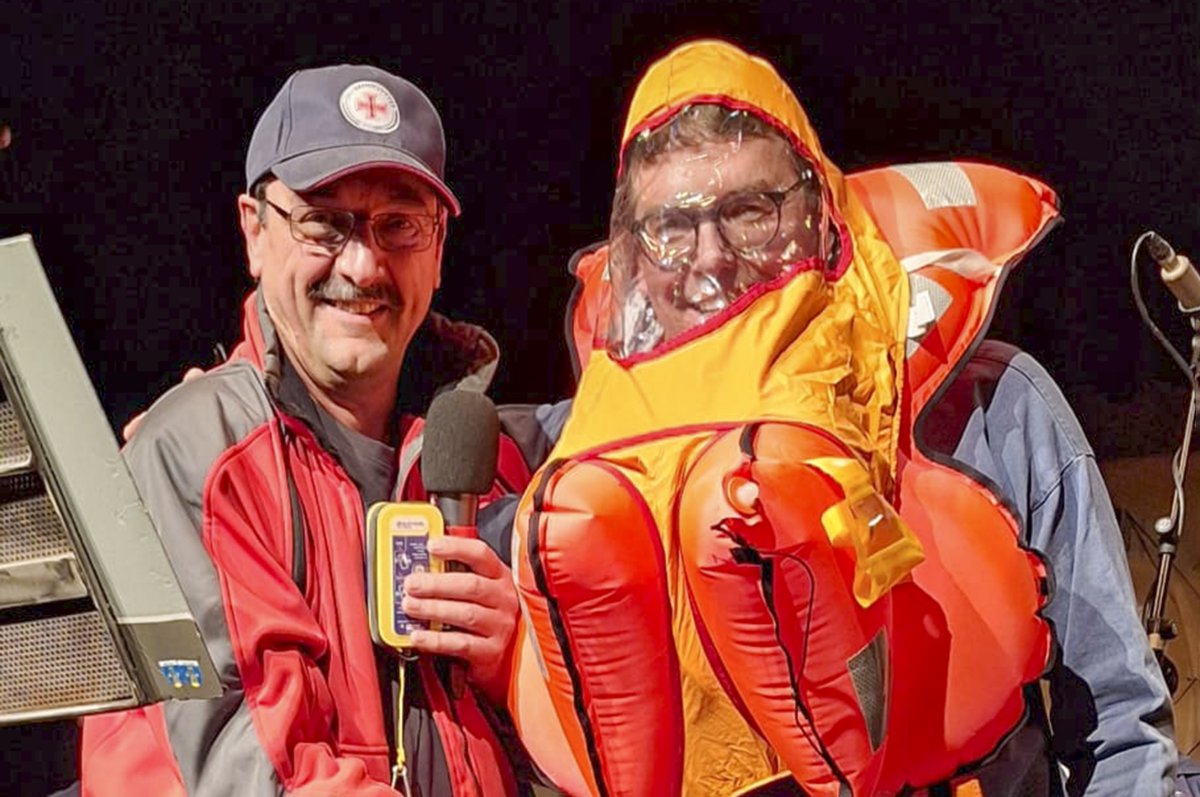 Die Demonstration einer Rettungsweste der DGzRS an Moderator Jörg Winterbauer durch Rettungsmann Peter Zurborg war ein kleines Highlight, auf dass auch ein jeder wisse, wie das auf See und im Ernstfall funktioniert. Es brachte viel Gelächter in die Halle – so kann Wissen vermittelt werden!