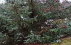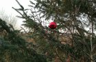 Eine prägnante rote Kugel ist nicht mehr für ein normales menschliches Wesen zum Greifen nah, hängt dafür durch die Natur zärtlich aufgespießt von einer Tannennadel und zeigt Haltung.