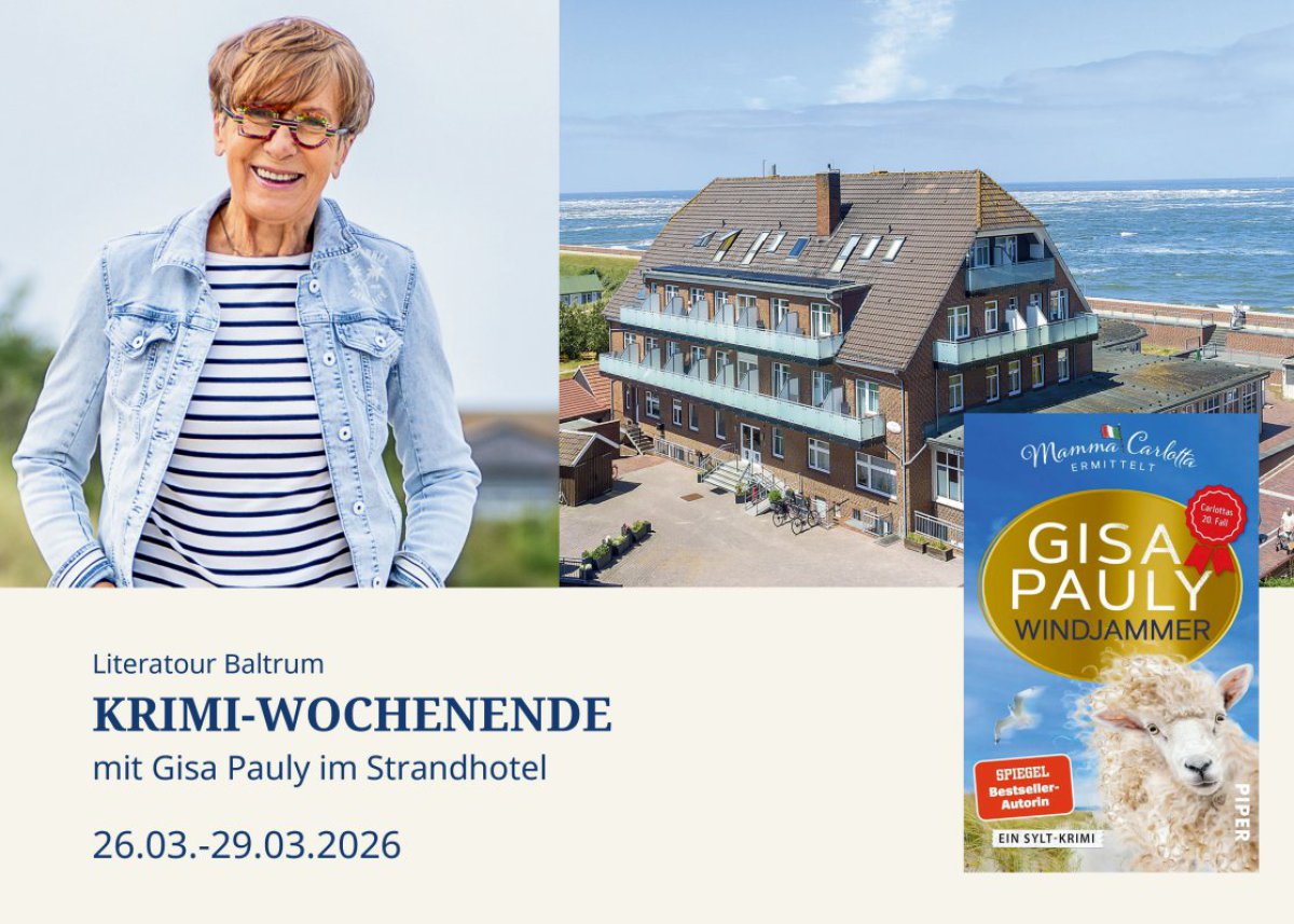 Bestseller Autorin Gisa Pauly wird Ende März auf Baltrum sein. Das Strandhotel bietet daher vom 26.3.-29.03.2026 ein Krimi-Wochenende Arrangement. Darin enthalten sind 3 Übernachtungen, Hafentransfer, 3-Gang-Menüs, gemeinsames Frühstück mit der Autorin, Dorfführung, Lesung, Wattwanderung und Teezeremonie.