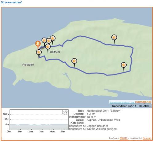 Sportlicher Träger ist die Kurverwaltung Baltrum. Start auf dem Dorfplatz Baltrum. Start-Koordinaten: 53° 43‘ 45.34“ N, 7° 22‘ 16.85“ E. Ziel Dorfplatz Baltrum, Ziel-Koordinaten: 53° 43‘ 45.34“ N, 7° 22‘ 16.85“ E. Länge der Strecke 10,6 km. Startnummernausgabe ist im Sitzungssaal des Rathauses, 1. OG. Umkleidemöglichkeiten gibt es im Haus des Gastes (Turnhalle), Toiletten & Duschen befinden sich im SindBad, in der Mehrzweckhalle, im Sanitärgebäude Ost beim Jugendclub, bei Starks Strandladen.