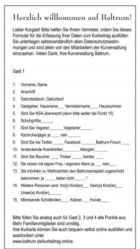 Die Gästedaten sind nach anhängendem Formular vom Gast abzufragen. Der Kurbeitrag wird mit Ausfüllen des Formulars gültig. Bei Verlust verliert er keine Gültigkeit. Das Geld ist pünktlich abzuliefern. Gruppen sind seitens des Vermieters angehalten, ausschließlich die Wege über die Strandmauer/Palisadenwand und den Flughafen zu nehmen, um sich direkt im Hafen einzufinden.