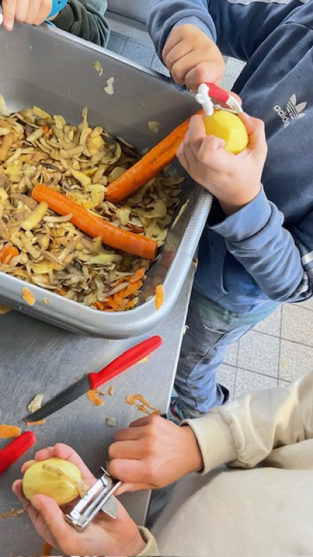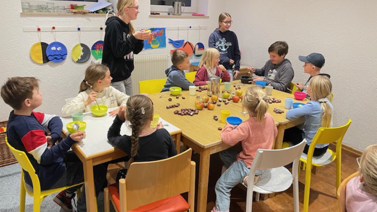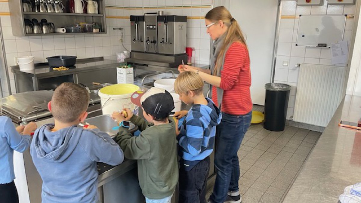 Da aber im Schulgarten auch ein großer Kürbis wuchs, hat die Sonnenhütte ihre Räume zur Verfügung gestellt, um dort eine leckere Kürbissuppe zu zaubern. Es gab viele Aufgaben, die die Kinder super übernommen haben: schälen und schneiden des Gemüses, den Tisch decken und natürlich auch ein bisschen beim Kochen zu helfen. Am Ende durften die Kinder die Kürbissuppe genießen.