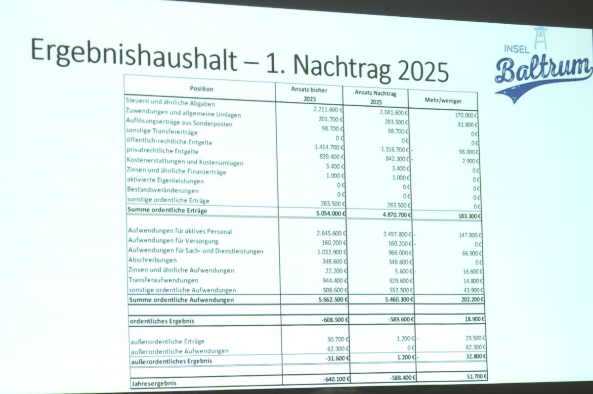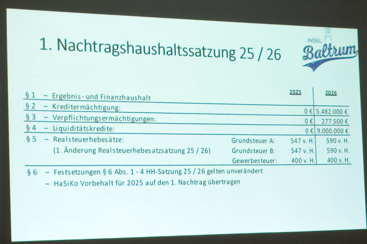 Die Messbetragssumme für die Hebesätze der Grundsteuern sei um 19.000 Euro gegenüber dem Ansatz im Doppelhaushalt 25/26 zurückgegangen, stellte Baltrums Kämmerer Dennis Pollmann bei der Ratssitzung am 14. November fest. Das bedeutet, dass der ursprüngliche aufkommensneutrale Hebesatz für Grundsteuer A und B von 574 für 2025 um 13 Prozent erhöht hätte werden müssen (auf 560) und nunmehr für 2026 auf 590 von Hundert steigt. Die Gewerbesteuer bleibt auf 400 v. H..