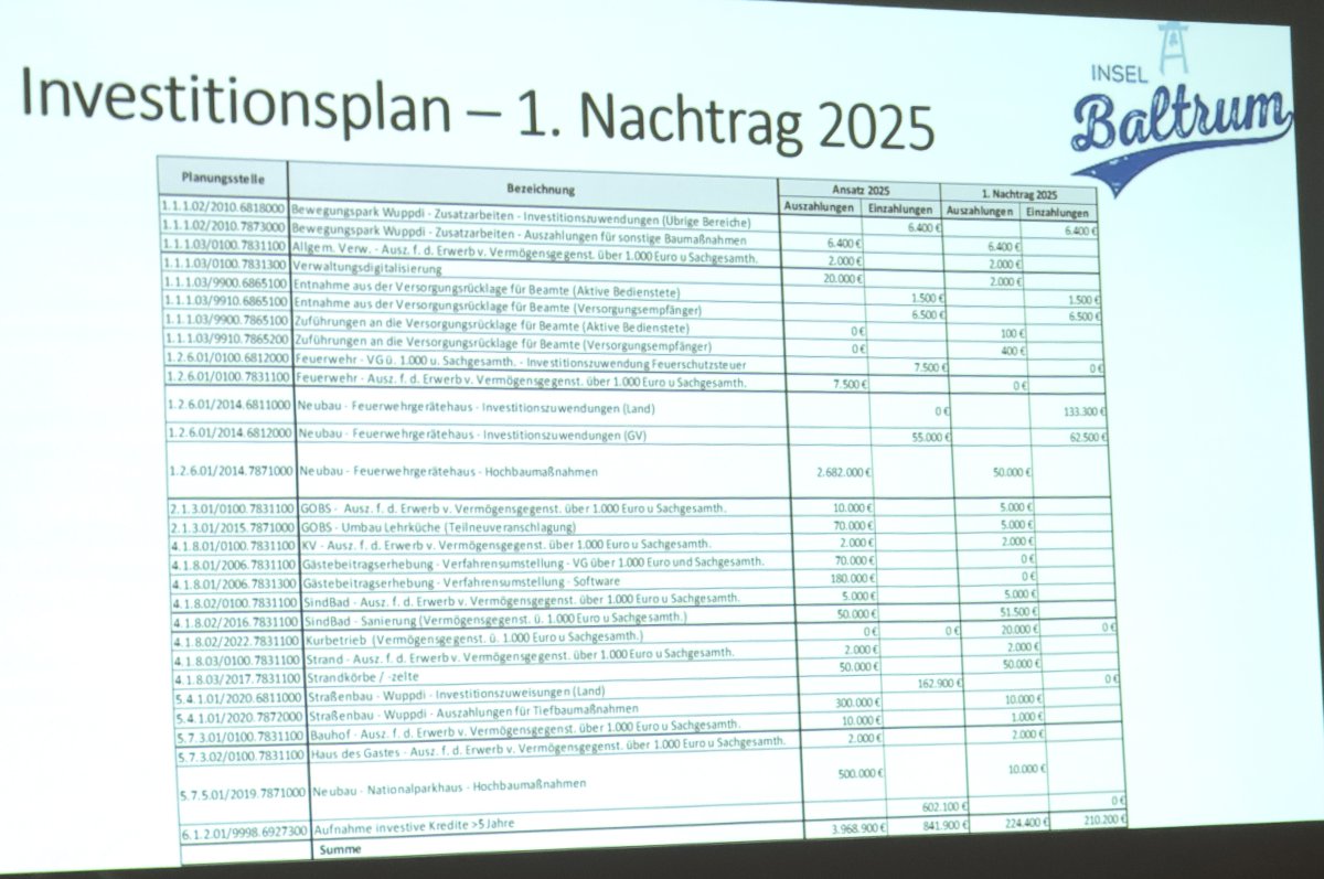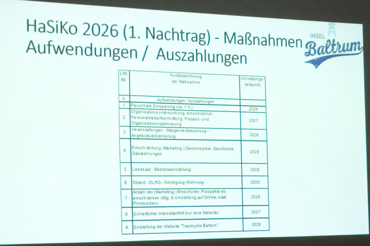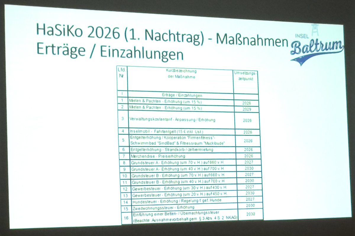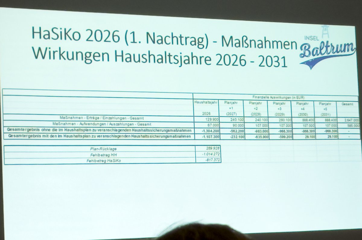 Bis 2029 wird die Gemeinde Baltrum ein Fehl von 3,50 Mio Euro angehäuft haben, das fortan, schon ab 2026, mit einem Haushaltssicherungskonzept zu verwalten ist, stellte Pollmann in Aussicht. Dies sind Maßnahmen wie Erhöhung der Mieten und Pachten, Entgelterhöhungen SindBad, Strandkorbvermietung, ab 2027 nochmal Grundsteuern A und B und die Hundesteuer, ab 2030 Zweitwohnungssteuern und Einführung einer Betten- und Übernachtungssteuer. Einsparungspotenzial und Mehreinnahmemöglichkeiten seitens der Gemeinde tauchen im Haushaltsplan zwar „ansatzweise“ auf, allerdings ohne konkretes Konzept.