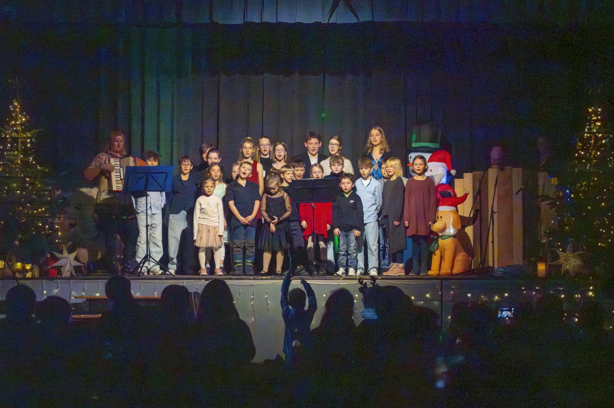 23 Kinder sangen beim Kindernikolausball am Donnerstag, dem 4. Dezember 2025, als „Kindershantychor Baltrum“ auf der großen Bühne im geschmückten und gefüllten Saal der Turnhalle auf Baltrum. Das ist Rekord.