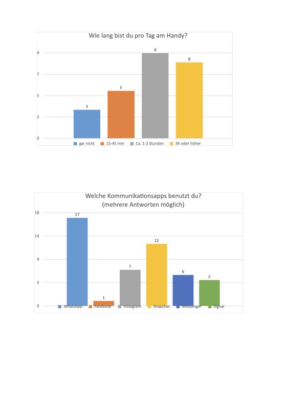 Die Ergebnisse zeigen, dass 17 unserer Schülerinnen und Schüler überwiegend ein bis zwei oder sogar mehr als drei Stunden am Tag mit dem Handy beschäftigt sind. Bei einer repräsentativen Umfrage aus dem Jahr 2024 verbringen 34 Prozent der Kinder im Alter zwischen 10 bis 12 Jahren mehr als zwei Stunden täglich am Handy, in der Altersgruppe bis 15 Jahre sind es sogar 59 Prozent. Am beliebtesten ist dabei an unserer Schule auf Baltrum die Kommunikationsapp WhatsApp, gefolgt von Snapchat, vor allem, um Freunde und Familie zu kontaktieren. Auch bei einer offiziellen Umfrage von 2022 wurde festgestellt, dass WhatsApp am beliebtesten ist. Dabei besitzen 16 unserer Schülerinnen und Schüler ein eigenes Handy und einen Fernseher, knapp die Hälfte auch ein iPad. Beruhigend für die Lehrkräfte ist, dass tatsächlich zehn Schülerinnen und Schüler täglich im Buch lesen und immerhin noch fünf einmal pro Woche.