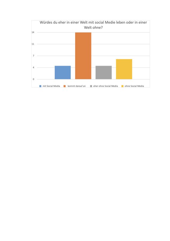 Überrascht hat uns, dass viele Schülerinnen und Schüler angegeben haben, dass sie nicht selbstverständlich in einer Welt mit Social Media leben wollen, sondern für sie bestimmte Bedingungen daran geknüpft sind. Sechs Kinder bzw. Jugendliche gaben sogar an, dass sie sich gut eine Welt ohne Social Media vorstellen könnten.