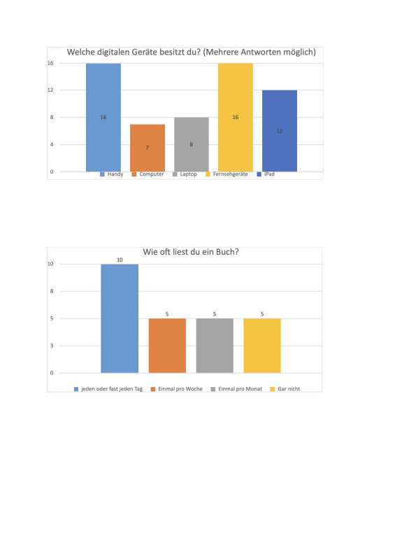 Dies hat die Klasse 6 im Deutschunterricht zum Anlass genommen, eine Umfrage in den Klassen 3 bis 10 zu diesem Thema durchzuführen. Dabei wurde zwischen den Altersgruppen nicht unterschieden, da die Befragung anonym sein sollte und man sonst auf einzelne Schülerinnen und Schüler eventuell hätte rückschließen können. Ziel war es vielmehr, den Medienkonsum und die Verwendung der Medien insgesamt an unserer Schule zu eruieren. Deshalb hat die Klasse 6 sich sechs Fragen zu diesem Thema überlegt und 25 Schülerinnen und Schüler befragt.