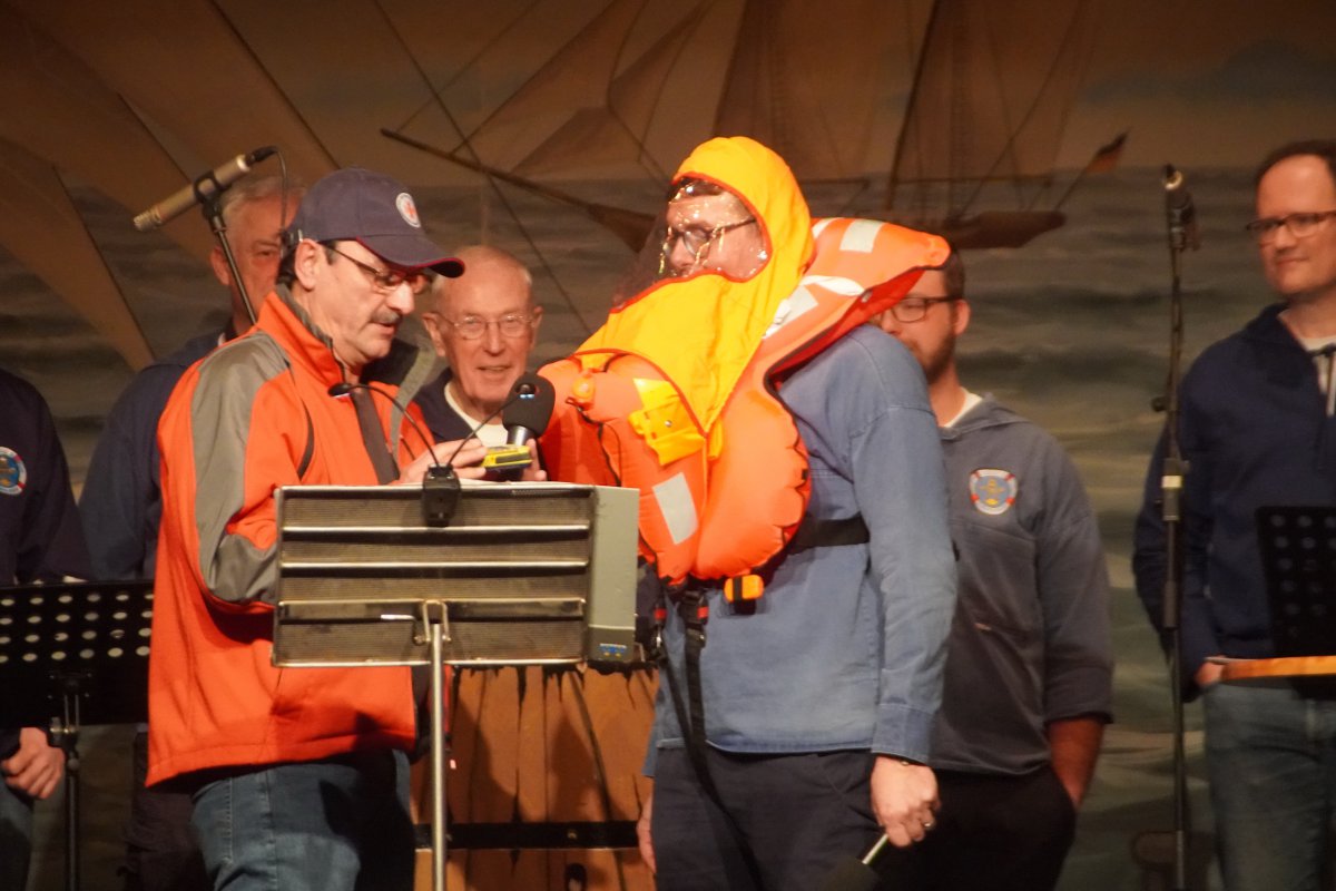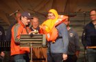 Die Demonstration einer Rettungsweste der DGzRS an Moderator Jörg Winterbauer durch Rettungsmann Peter Zurborg war ein kleines Highlight, auf dass auch ein jeder wisse, wie das auf See und im Ernstfall funktioniert. Es brachte viel Gelächter in die Halle – so kann Wissen vermittelt werden!