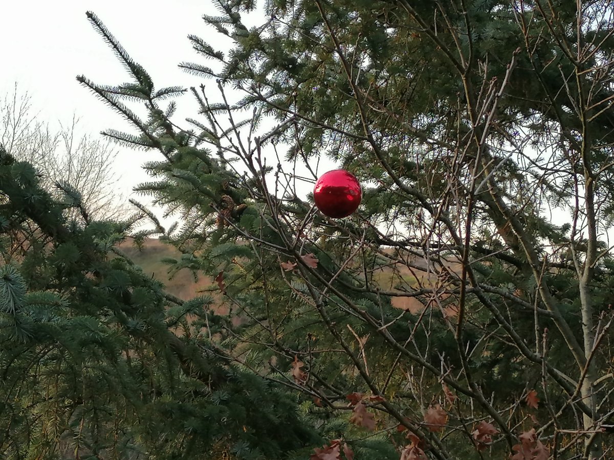 Eine prägnante rote Kugel ist nicht mehr für ein normales menschliches Wesen zum Greifen nah, hängt dafür durch die Natur zärtlich aufgespießt von einer Tannennadel und zeigt Haltung.