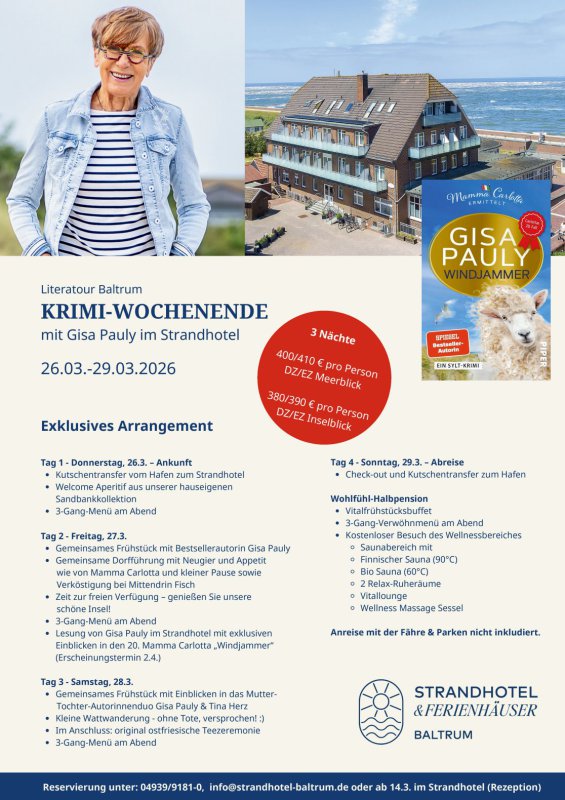 Bestseller Autorin Gisa Pauly wird Ende März auf Baltrum sein. Das Strandhotel bietet daher vom 26.3.-29.03.2026 ein Krimi-Wochenende Arrangement. Darin enthalten sind 3 Übernachtungen, Hafentransfer, 3-Gang-Menüs, gemeinsames Frühstück mit der Autorin, Dorfführung, Lesung, Wattwanderung und Teezeremonie.