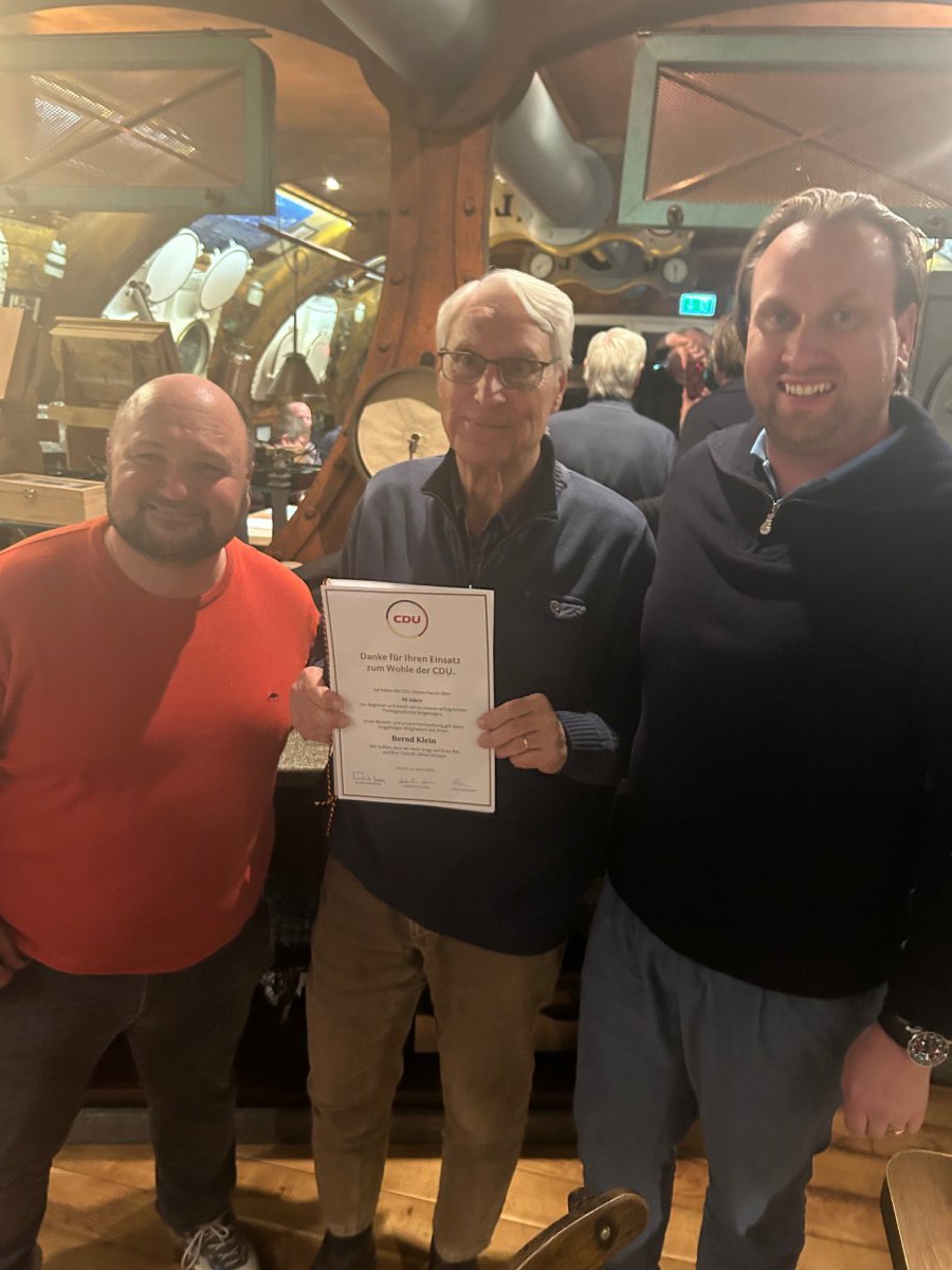 Ein Highlight der Veranstaltung waren die Ehrungen für langjährige Mitgliedschaften. Vorab wurde darauf hingewiesen, dass bei einer der nächsten Versammlungen weitere Ehrungen vorgenommen werden. Bernd Klein ist bereits seit 50 Jahren Mitglied der CDU. Unter großem und anhaltendem Beifall nahmen Andreas Rothengaß und Galt Heiken diese besondere Ehrung vor. Neben dem Kreisvorsitzenden aus Aurich und dem Landesvorsitzenden aus Hannover waren auch persönliche Zeilen des Bundesvorsitzenden Friedrich Merz zu lesen. Zudem wurde die Ehrennadel in Gold überreicht. Im Namen des CDU-Gemeindeverbandes bedankte sich Andreas Rothengaß nochmals bei Bernd Klein und hoffte, dass er den Gemeindeverband auch weiterhin unterstützen wird.