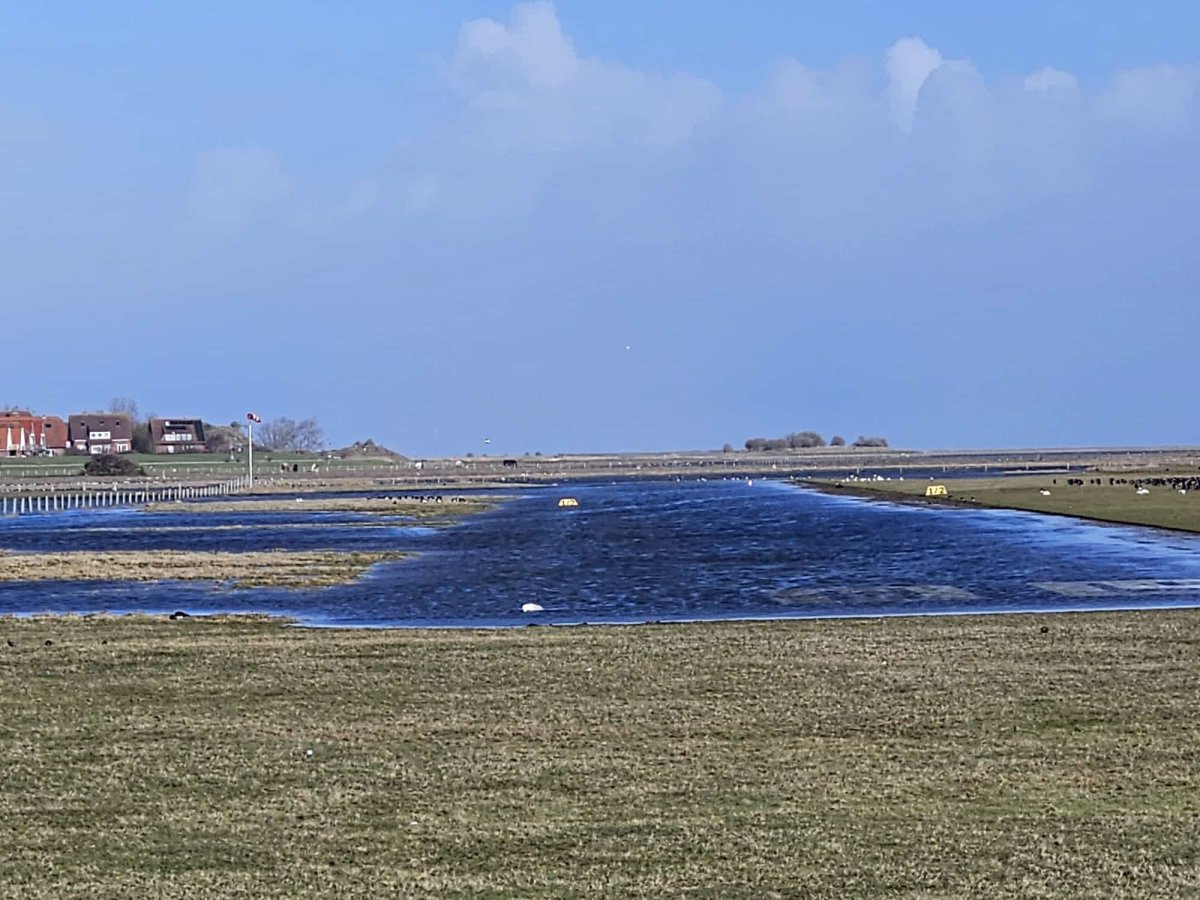 Das Bild spricht für sich! Pünktlich zum Beginn der Ostersaison kann am 01.04.26 der „umgebaute“ Flugplatz in Betrieb gehen. In Zukunft können nur noch Wasserflugzeuge auf (oder in) der Insel landen. - Nachdem das Pflaster der Landebahn entfernt wurde und ein guter Meter Unterbau weg gebaggert wurde, war nur eine Flut nötig, um die Landebahn für Wasserflugzeuge „fertig zu stellen“. Die neue Wasserfläche ist ca. 1m tief und für kleine Wasserflugzeuge geeignet.