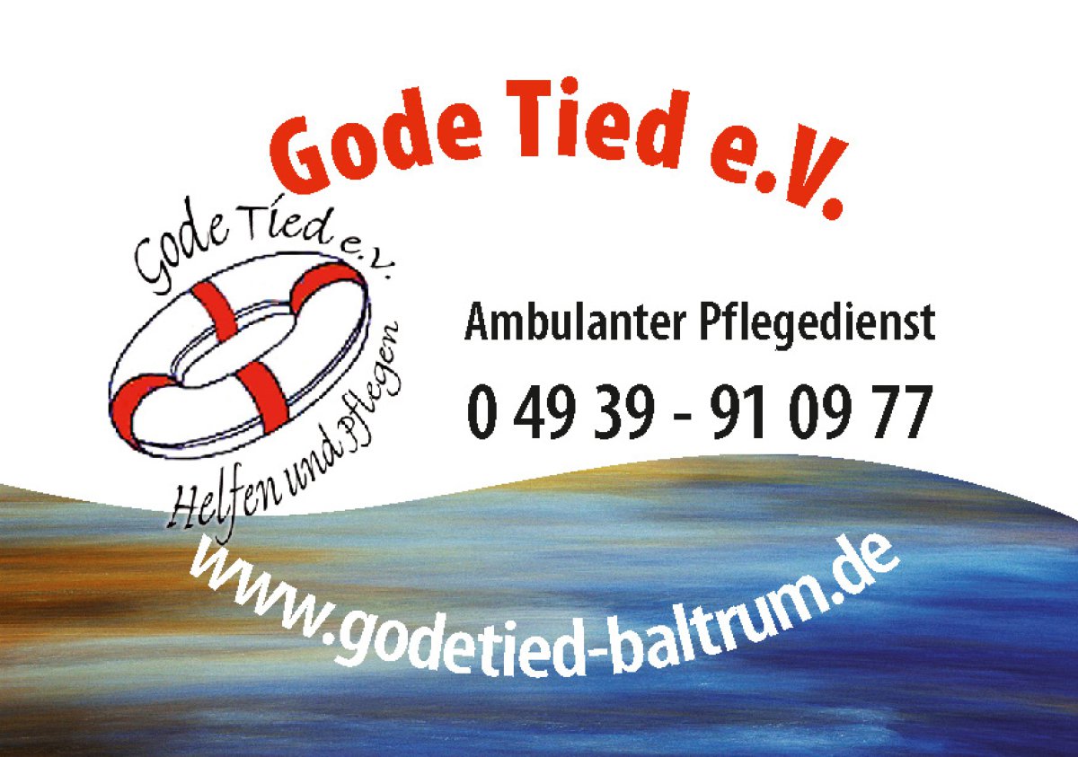 Hinter der Pflege auf Baltrum steht seit 20 Jahren ein Verein: Gode Tied. Um die 150 Mitglieder tragen mit Beiträgen und Spenden dazu bei, dass Pflege auf der Insel gut funktioniert. Zwei bis drei angestellte Fachkräfte kümmern sich dauerhaft um die häusliche Pflege der Bedürftigen auf der Insel und bieten darüber hinaus notfalls – und sofern es die Zeit zulässt – ihre Dienste auch für Gäste an. Zudem kann man sich dort bei Bedarf Hilfsmittel vom E-Mobil bis zum Krankenbett leihen. Das Büro bedindet sich mitten im Dorf im Haus N° 57.