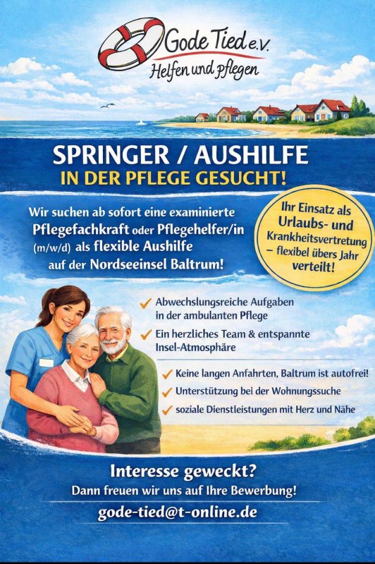 Der Pflegeverein Gode Tied sucht eine examinierte Pflegefachkraft bzw. eine Pflegehelferin oder einen Pflegehelfer als Urlaubs- und Krankheitsvertretung über das ganze Jahr für den flexiblen Einsatz auf der schönen Nordseeinsel und ist bei der Unterkunftsuche behilflich.