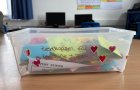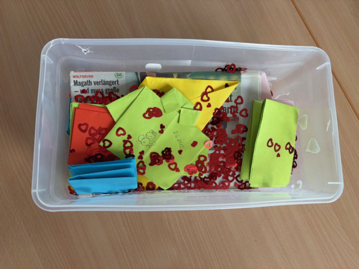 Nadine und Jan haben am 02.06.2012 hier auf Baltrum geheiratet. In dieser Box befinden sich zwei Zeitungen (Sportmagazin Kicker & Westdeutsche Allgemeine), die am Hochzeitstag herausgegeben worden sind. Außerdem befinden sich darin viele Briefe, in unterschiedlichen Farben. Die Inselschul-Reporterinnen vermuten, dass das frisch gebackene Ehepaar im Skippers Inn gewohnt hat, da sich ein Willkommensgruß in der Box befindet.